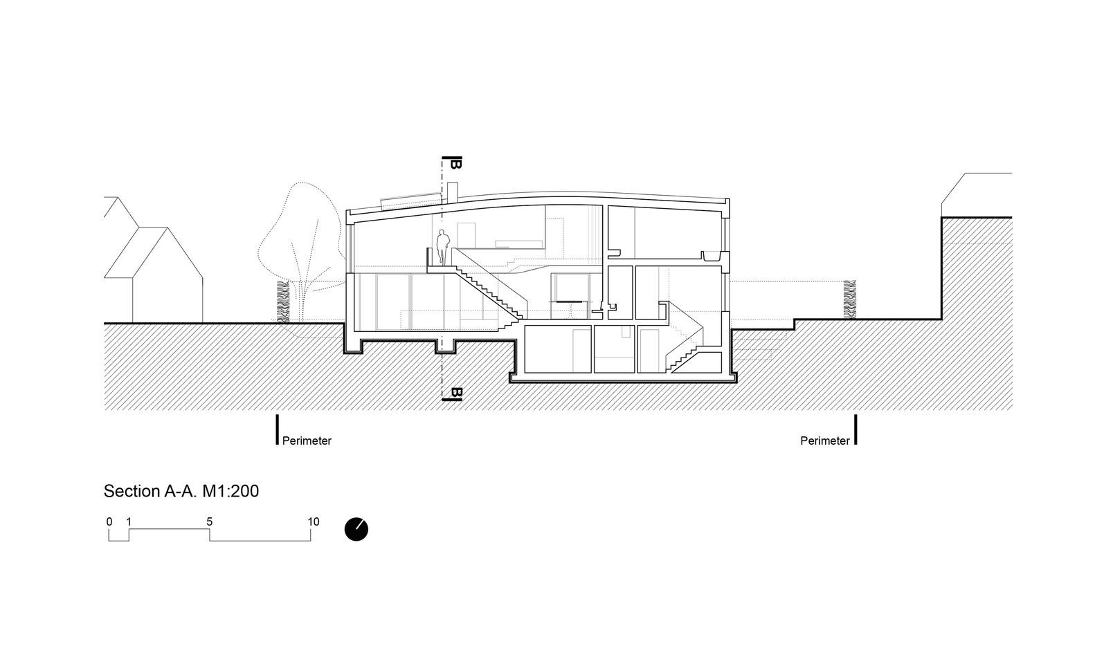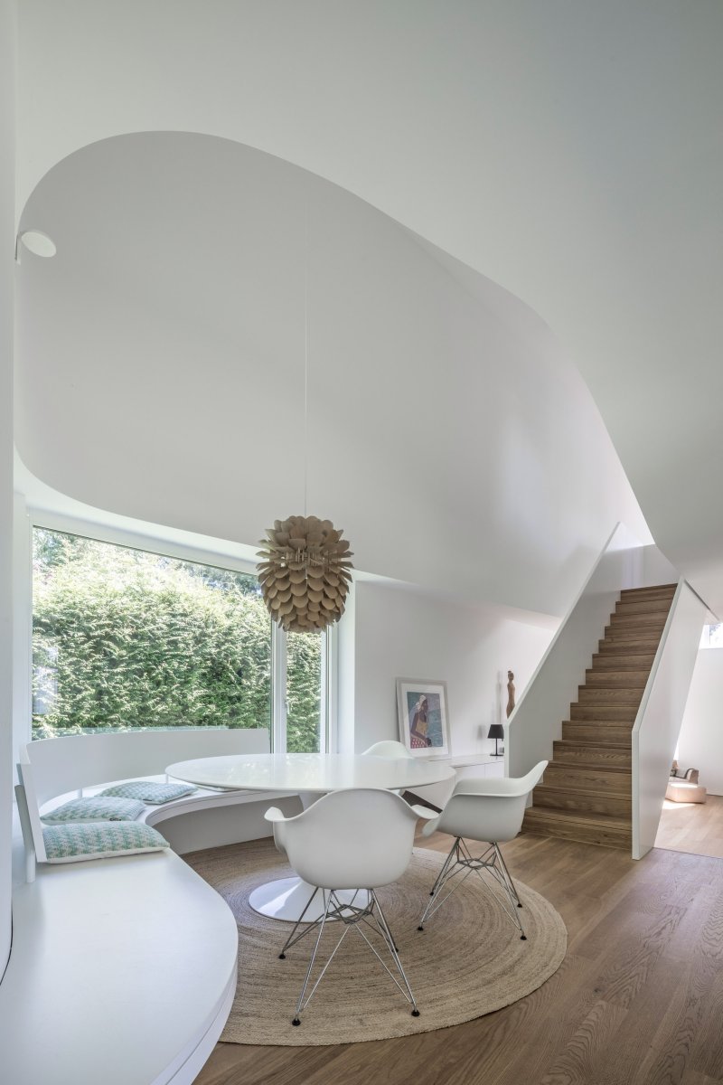 Obli simetrični krov je omogućio i nesvakidašnji oblik prostorija u unutrašnjosti. Sa druge strane, donji sektor kuće ima potpuno ravan moderan krov sa terasom.