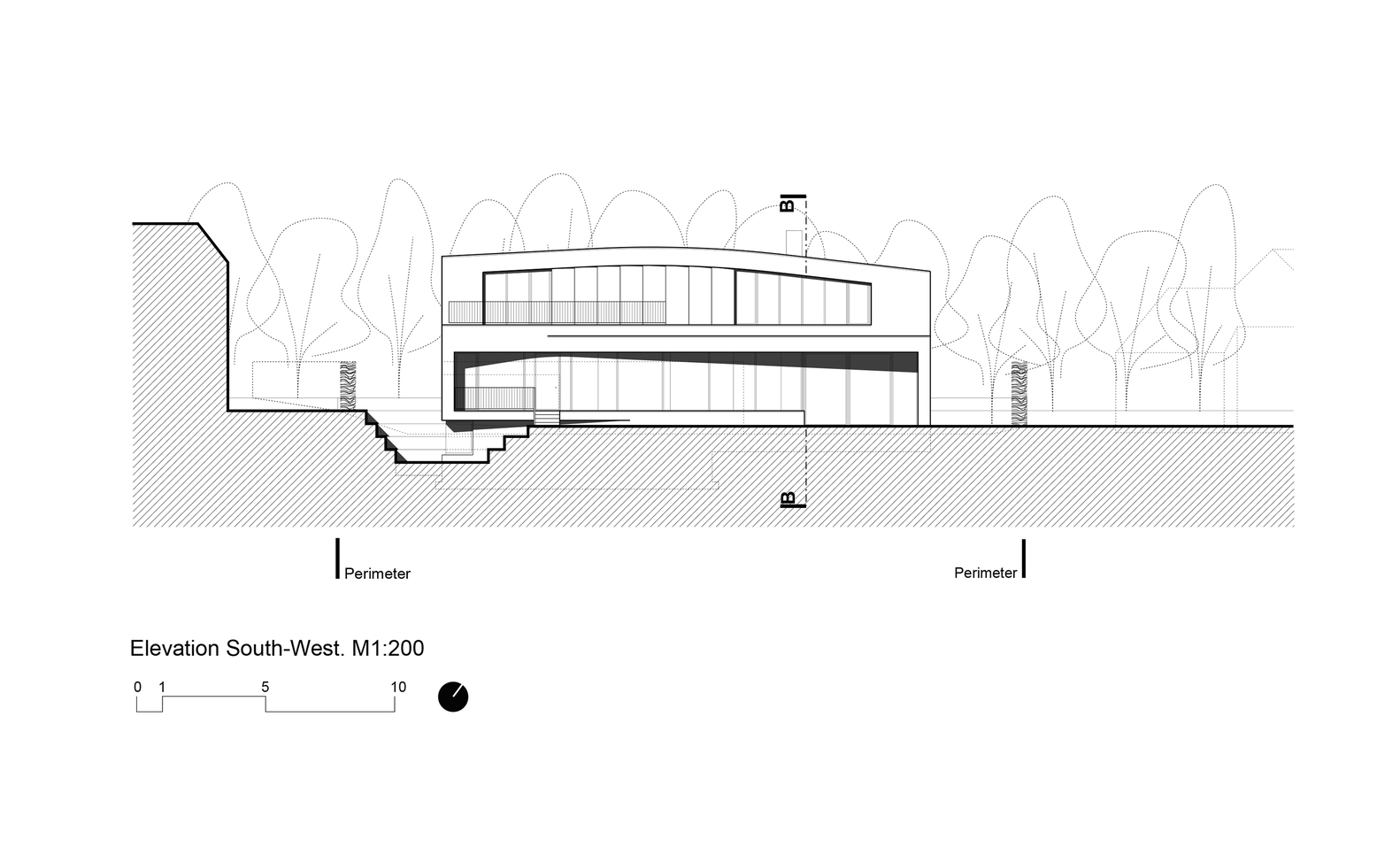 Dugačka južna fasada takođe je blago zaobljena, što pruža zanimljiv vizuelni efekat kada se kuća posmatra iz daljine. Ova zanimljiva rešenja uspela su da vizuelno povežu kuću sa njenom velikom baštom. Deo za sedenje tako je povezan sa isturenim delom fasade na istočnoj strani.