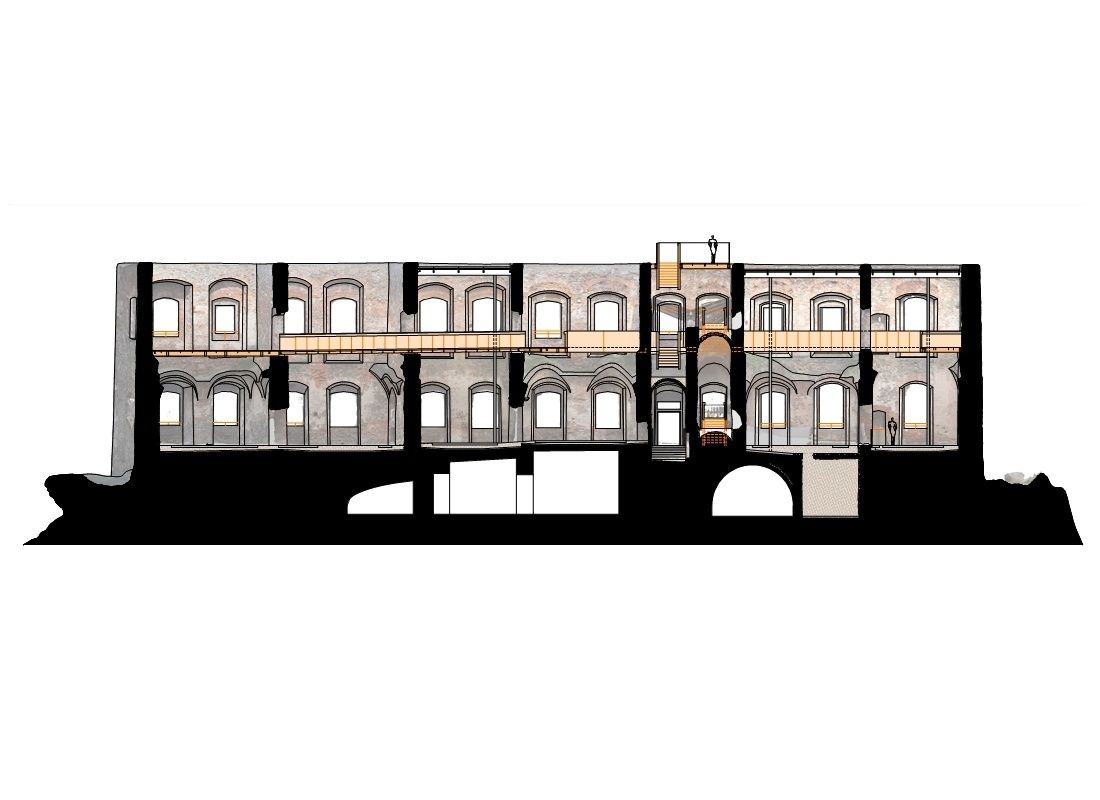 Kako bi posetioci mogli bolje da se upoznaju sa ovom istorijskom građevinom, arhitekte su ubacile nove pešačke rute povezujući prizemlje sa do sada nepristupačnim višim nivoima zgrade. Dodatni savremeni elementi jasno su prepoznatljivi i mogu se videti, a primenjene su tri vrste materijala, odnosno po jedan za svaki nivo. Tako je krov izveden u kombinaciji stakla sa čeličnim gredama, stepenište i mostovi su od korten čelika, dok su staze u prizemlju od poliranog betona.