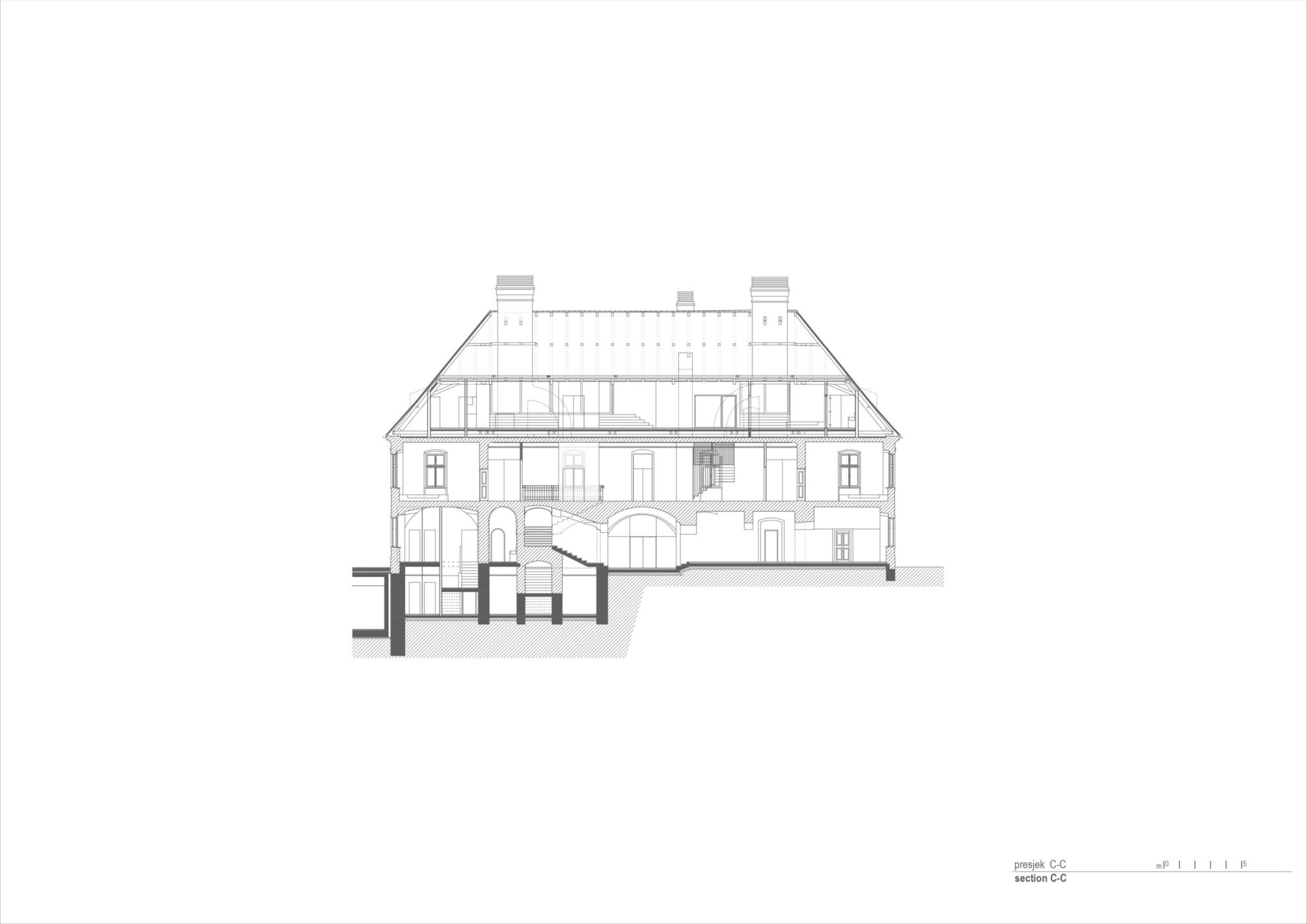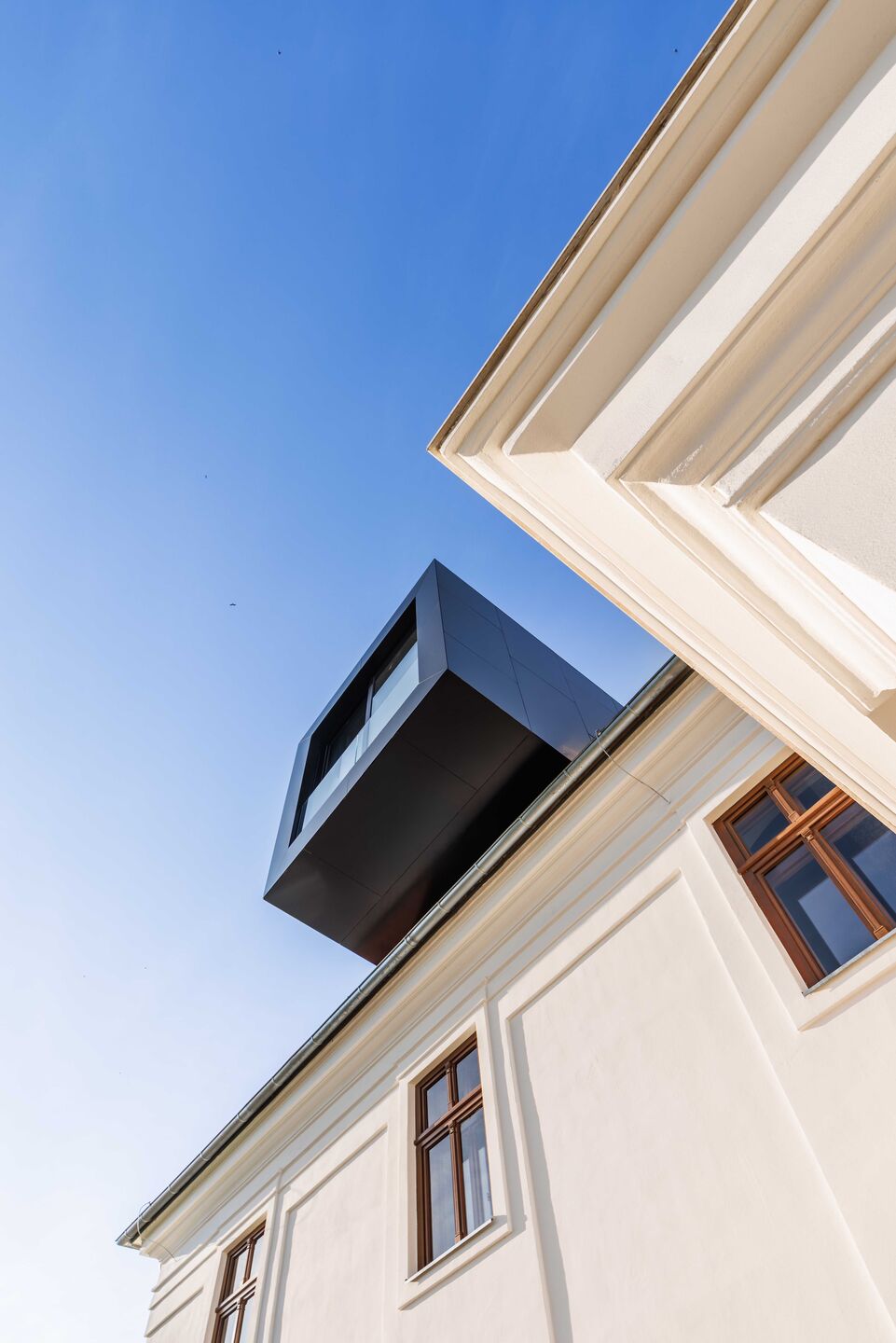 U neiskorišćeni krovni prostor zgrade iz 18. veka uglavljen je novi volumen, koji na dvorišnoj strani izbija kroz krovnu ravan u formi vidikovaca.