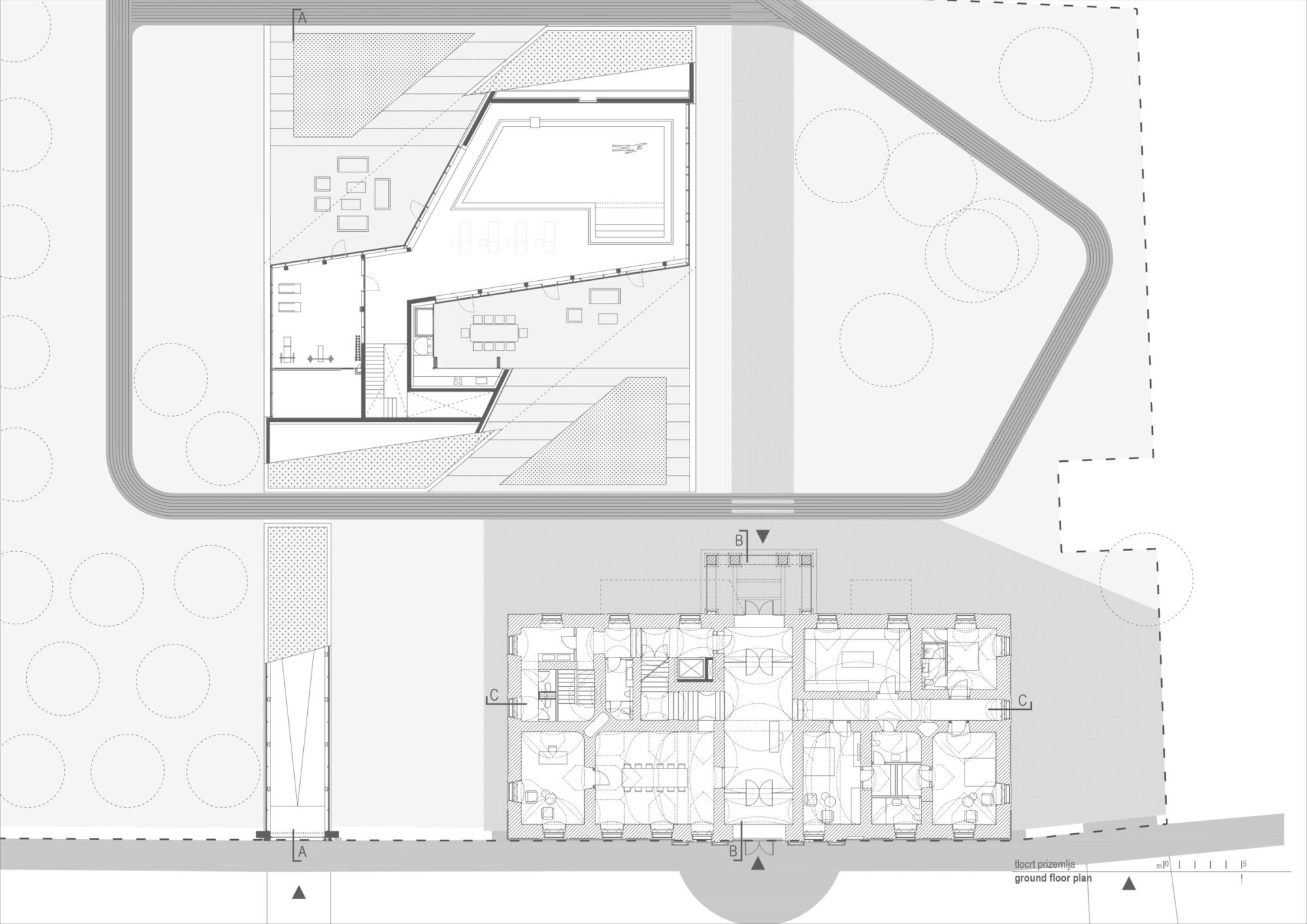 Određeni deo funkcija smešten je u okviru istorijske zgrade, dok su podzemna garaža, usluge i wellness sa bazenom smešteni u zadnjem delu dvorca, ispod travnate površine istorijskog parka, koji svojim odizanjem u bazenskoj zoni nagoveštava dinamiku novih funkcija.
