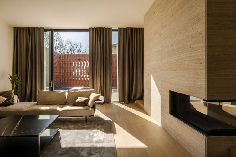 Introvertno prizemlje obuhvata dnevne prostore, fluidno organizovane oko niza servisnih blokova i orijentisane na sopstveni mikrosvet južnog dvorišta s bazenom. Ceo nivo je ‘omotan’ je masivnim obodnim teksturiranim zidom od opeke, kažu arhitekte za Vizkulturu.