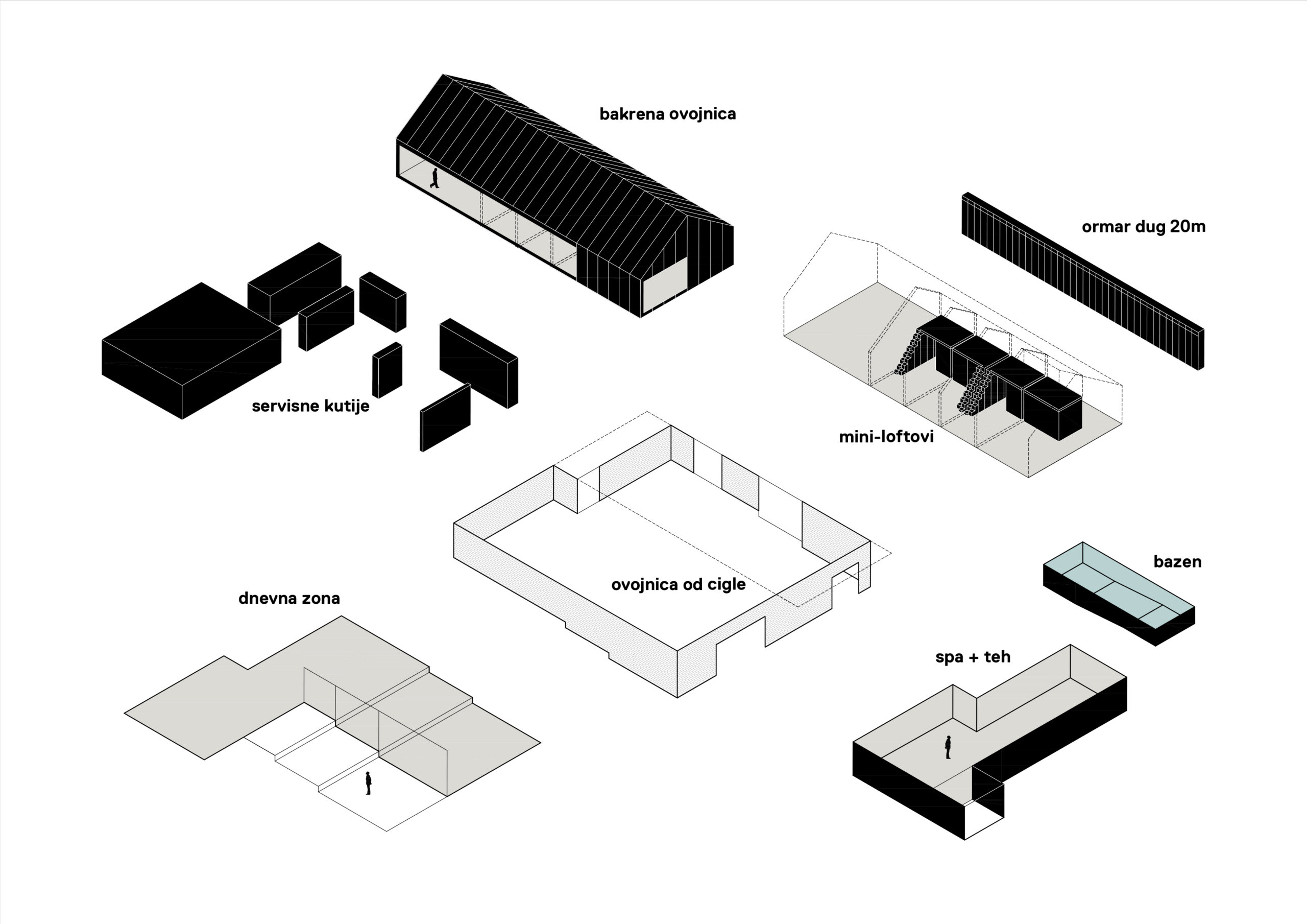 Kuća je koncipirana kao hibrid prizemne atrijumske kuće i izdužene arhetipske lamele.