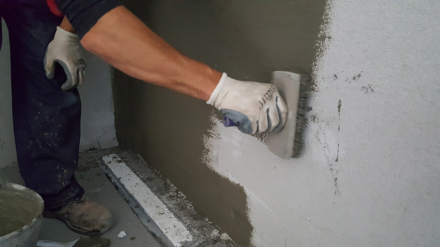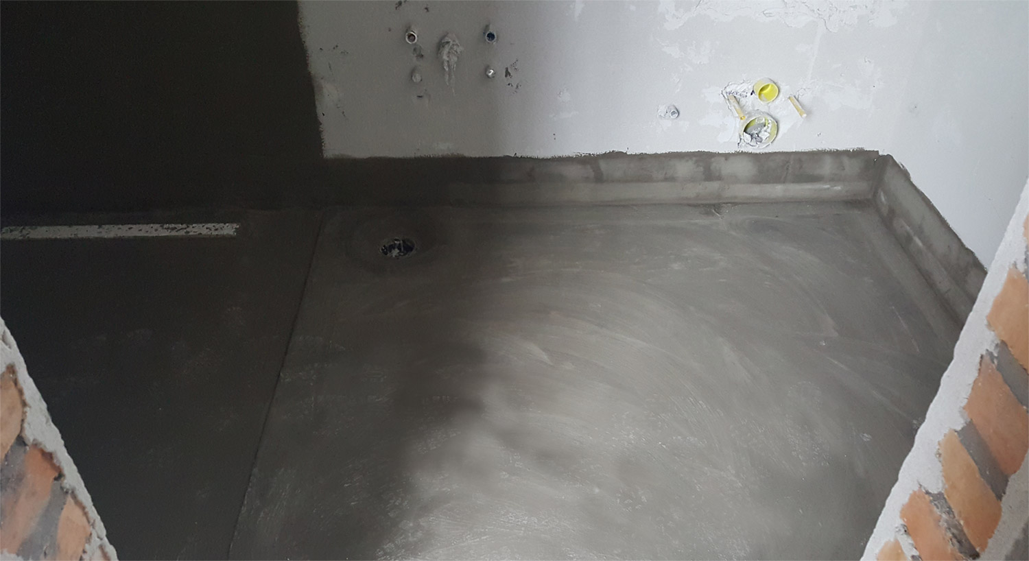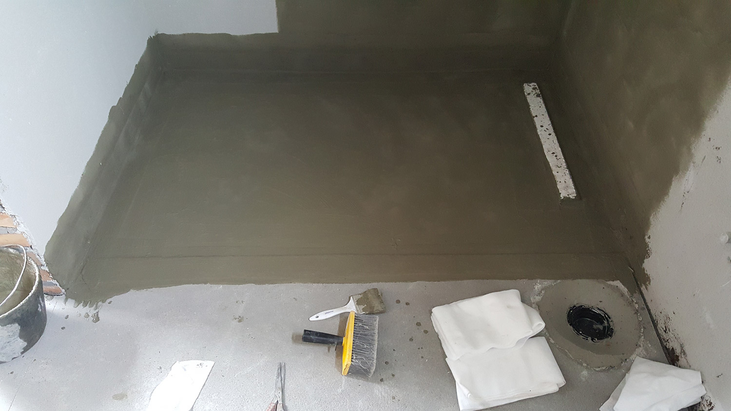 U našem primeru, u kupatilu smo na podu imali cementnu košuljica dok su zidovi bili omalterisani. Prvo se nanosi hidroizolacija na zidove pa onda tek na pod. Visina hidroizolacije u tuš kabinama se uglavnom radi do visine od 2 metra. Pošto smo u našem slučaju imali izvod za ružu tuša na većoj visini, hidroizolaciju smo naneli nešto iznad ove visine. U ostatku kupatila, van tuš kabine, dovoljna je visina sokle od 15 cm.