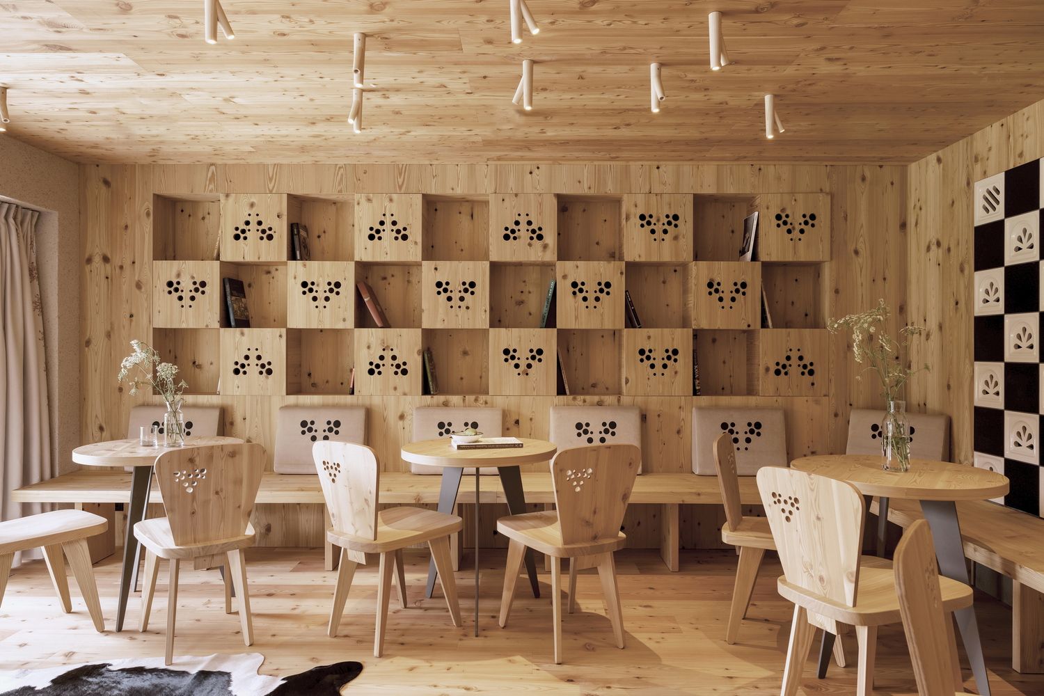 Rasveta u obliku grana pruža prijatnu i intimnu svetlost, dok su neke od stolice posebno usmerene na održivost i izvedene su od recikliranih plastičnih boca.