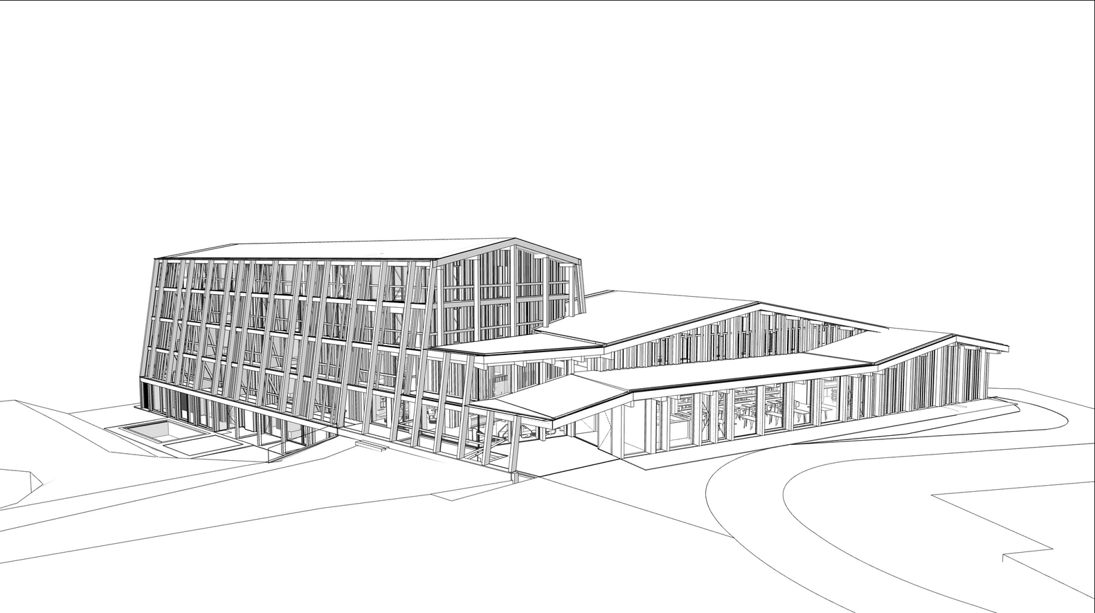 Dvovodni krovovi ostavljeni su u izvornom izgledu i inspirisali su nove trouglaste forme koje stvaraju prijatan dijalog sa planinskim vrhovima u pozadini. Celokupna nova fasada i novi arhitektonski elementi su inspirisani detaljima lokalne arhitekture, kao i lokalnim zanatskim radovima.