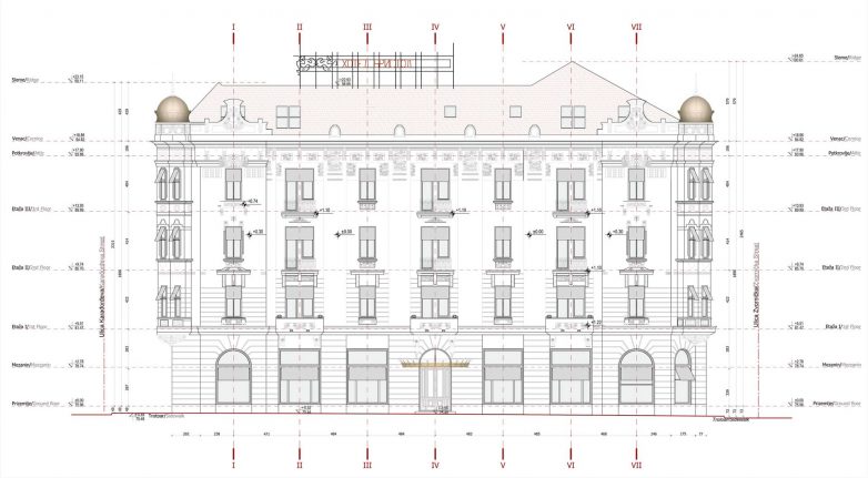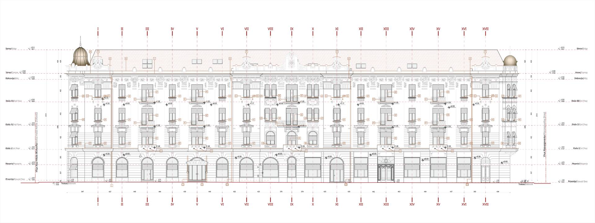 Celokupnu fasadnu kompoziciju završava duboko ispušten krovni venac, iznad koga se uzdiže reprezentativna i bogato dekorisana atika sa maskeronima u najvišoj tački centralne osovine i dodatno akcentovana kupolama na svih pet uglova objekta, navode arhitekte.