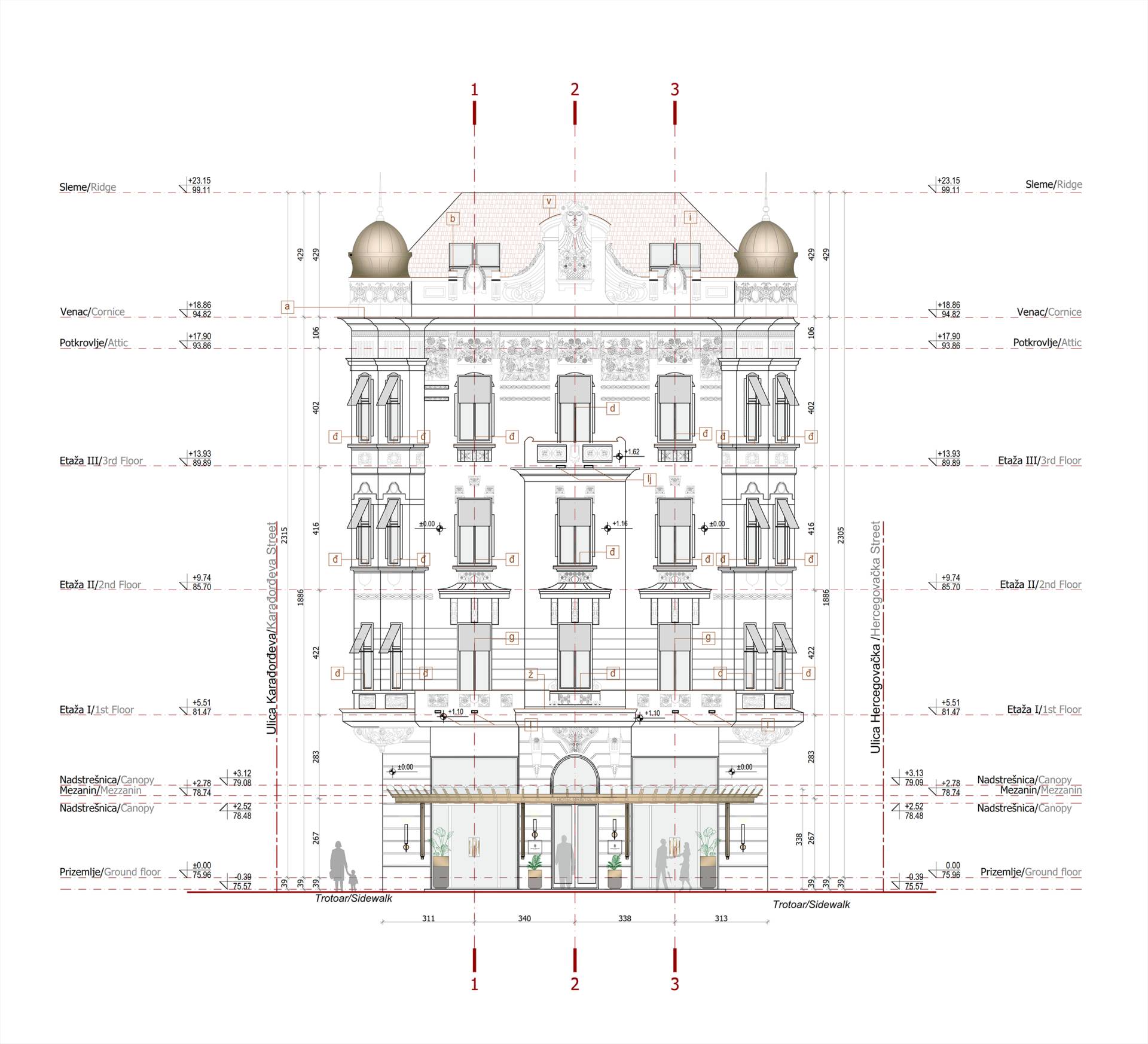 Аrhitektonskim rešenjem predviđena je restauracija i sanacija uličnih postojećih fasada ka Karađorđevoj ulici, Hercegovačkoj ulici, fasadi ugla Karađorđeve i Hercegovačke ulice, fasadi u Zvorničkoj ulici i ka ulici Hadži Nikole Živkovića.