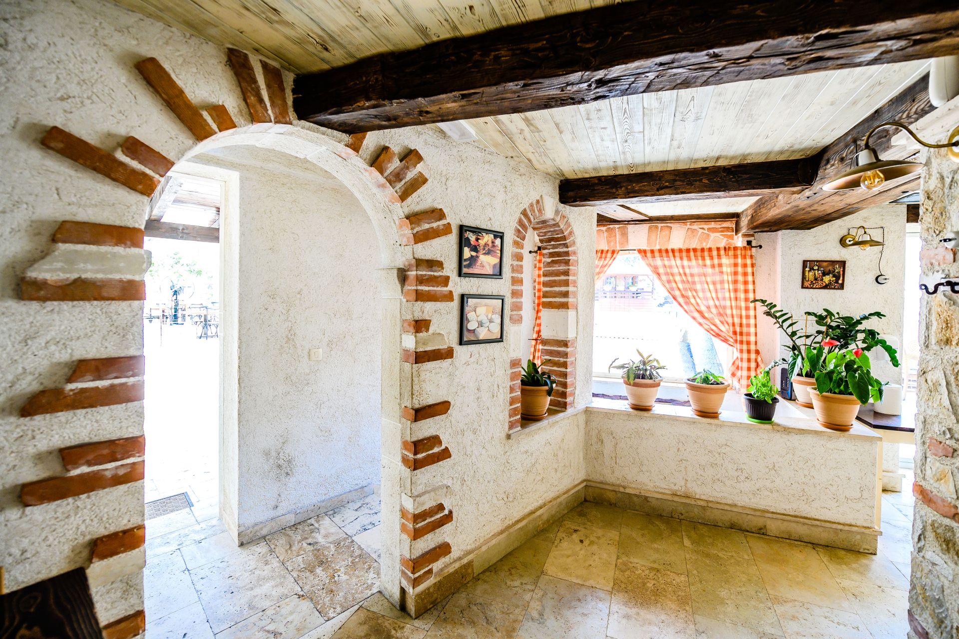Enterijer hotela, tradicionalnim motivima izvedenim spojem kamena i drveta, odiše elegancijom i otmenošću, pružajući posjetiocima osjećaj topline i udobnosti.