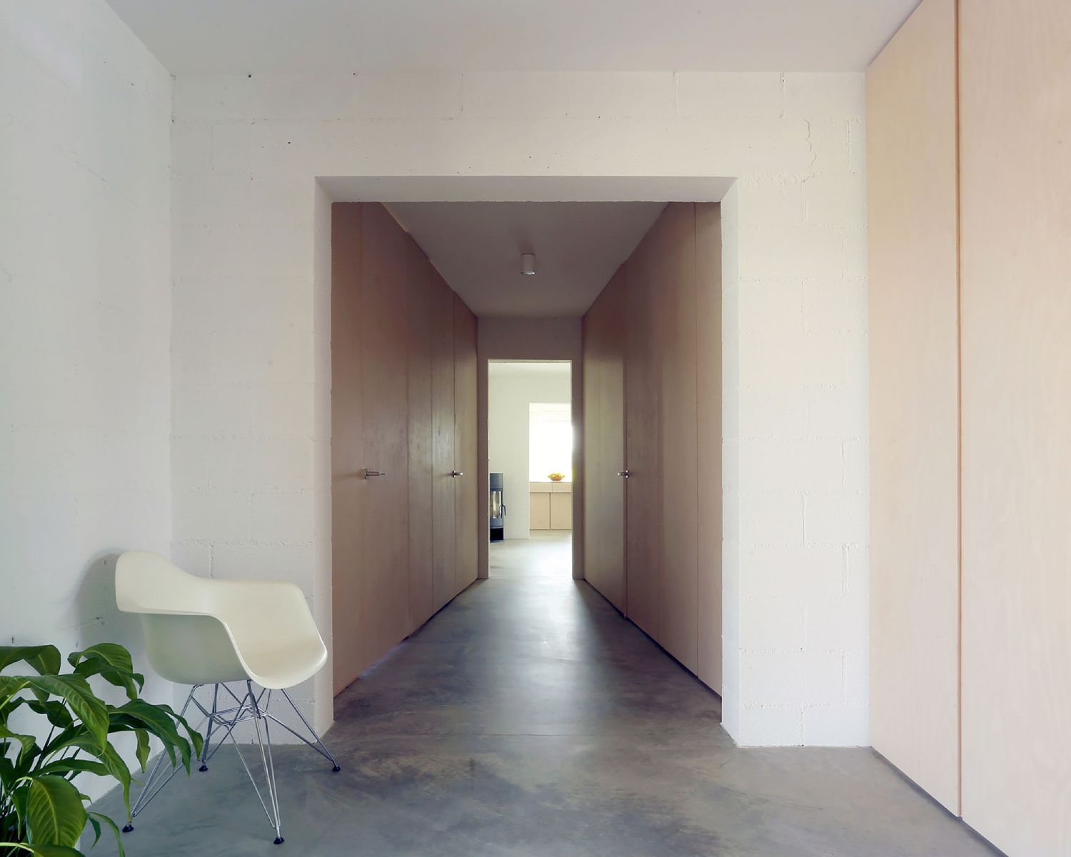 Unutrašnjost objekta izvedena je u minimalističkom dizajnu, te se mogu videti betonski šuplji blokovi, dok su pregradni zidovi od šperploče, koja na nekim mestima služi kao deo ugradnog nameštaja. Pod je od poliranog betona.