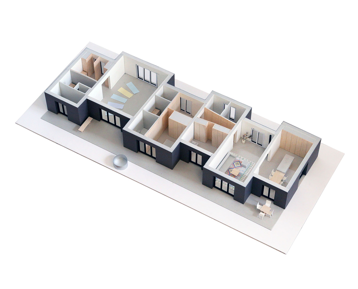 Po ulasku u objekat prvo se susrećemo sa malim joga studijom i pratećim sadržajem, dok je u nastavku odvojeni stambeni deo sa spavaćom sobom, kućnom kancelarijom, dnevnim boravkom, a na kraju je kuhinja sa trpezarijom.