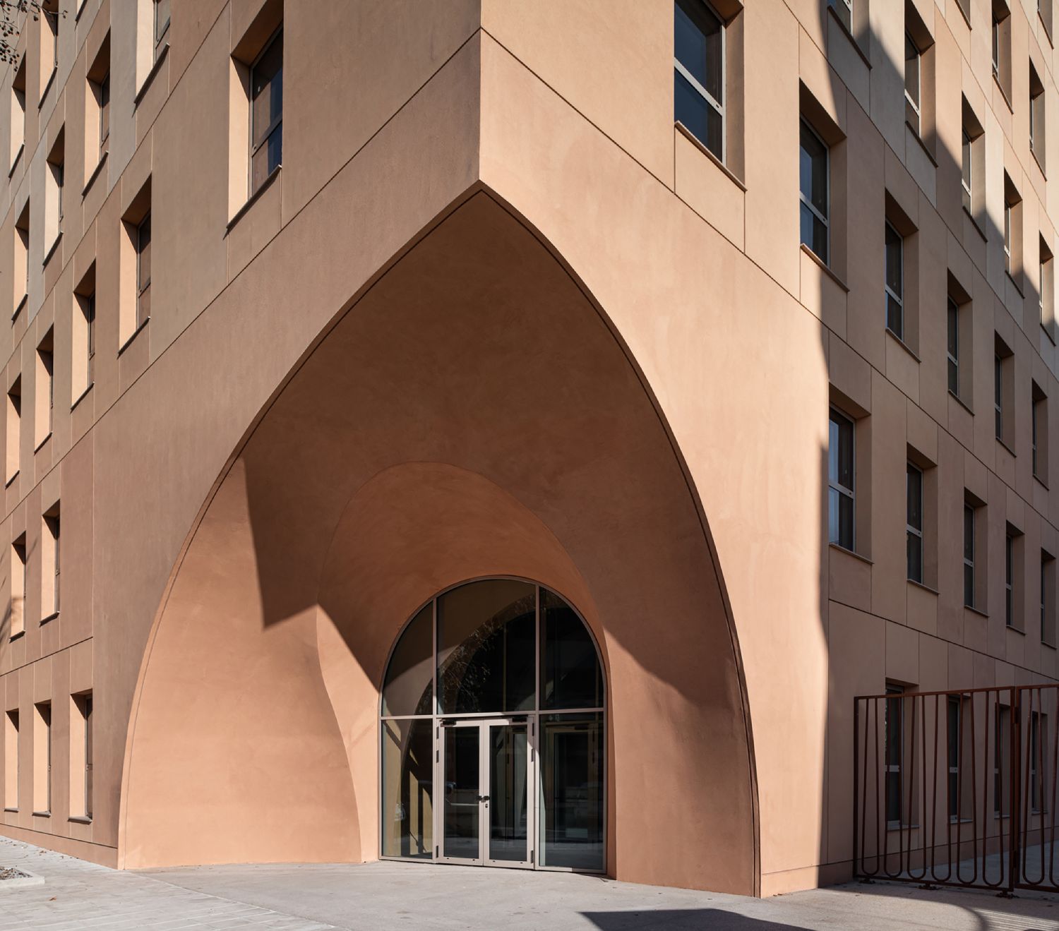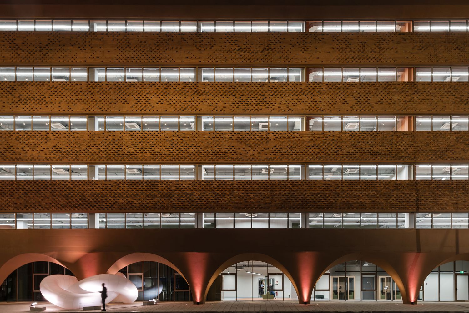 Fasada je izvedena od keramičkih opeka izrađenih po meri, koje su postavljene u trodimenzionalnom uzorku, a kroz pet različitih nijansi terakote.