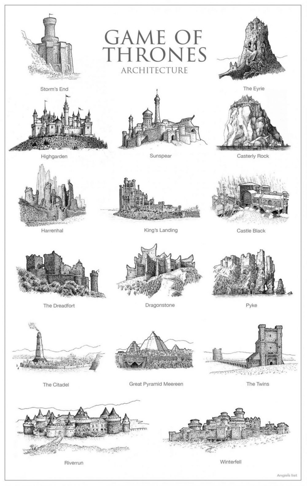 Kako bi prikazali njihovu sirovu lepotu sajt Angie’s List predstavio je seriju skica Fictional Architecture koja slavi arhitekturu ovih objekata u formi ilustracija. Papir i olovka poslužili su da se predstave neke od nezaboravnih arhitektonskih dela iz serije Igre prestola, filmova o Hariju Poteru, ostvarenja iz Marvelovog univerzuma ali i popularnih video-igara kao što je Skyrim.