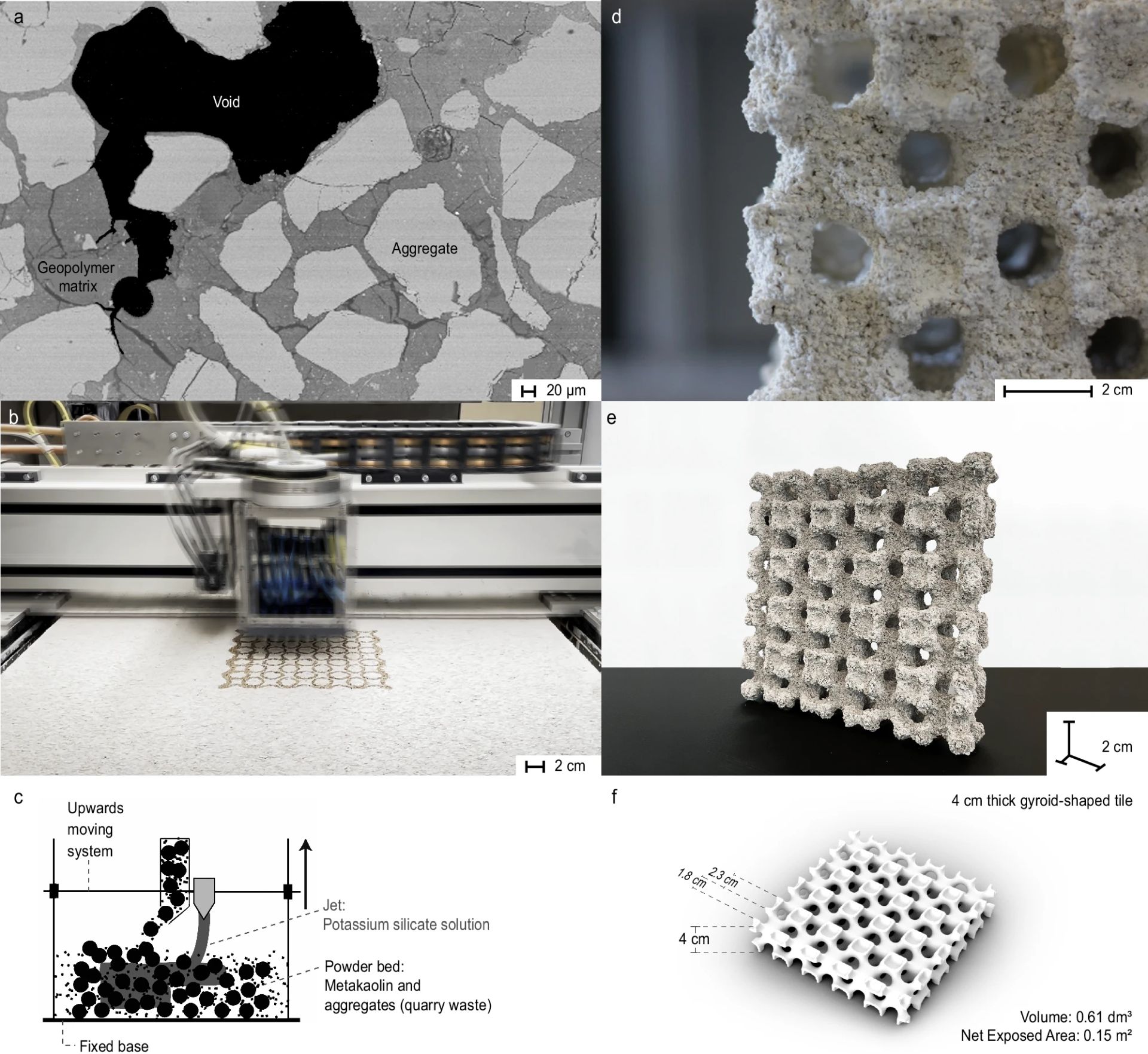 Ovaj materijal se uglavnom sastoji od fino mlevenog mermera, koji se dobija kao otpadni proizvod iz kamenoloma. U procesu 3D štampe uz pomoć vezivnog džeta, štampanje se kreće kroz sloj tog praha, nanoseći tečni geopolimer koji se sastoji od minerala poznatog kao metakaolin i alkalnog rastvora.