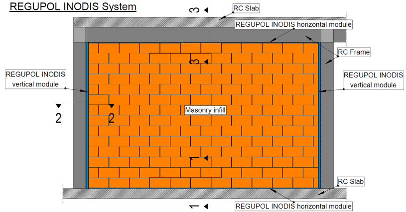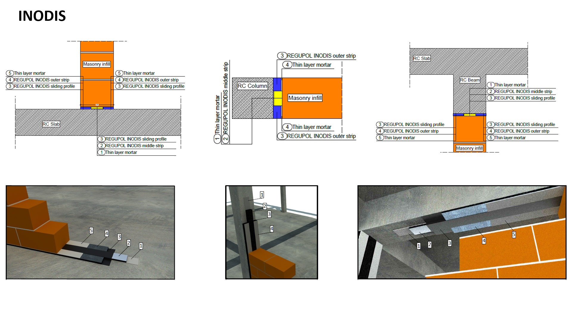 INODIS koristi elastične trake koje se jednostavno ugrađuju između zida i betonskog okvira. Sistem omogućava slobodno horizontalno pomeranje bez naprezanja zida a ujedno sprečava ispadanje zida van ravni, bez potrebe za ankerima komplikovanim za postavljanje. Primenljiv je na sve tipove zidnih elemenata i ne zahteva specijalne alate ili obuku.