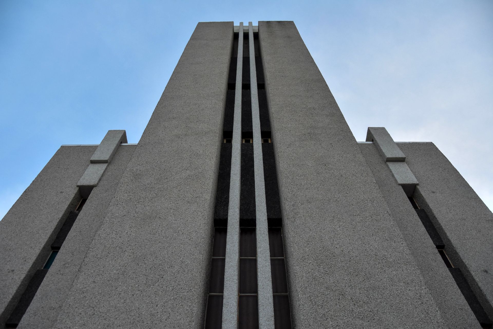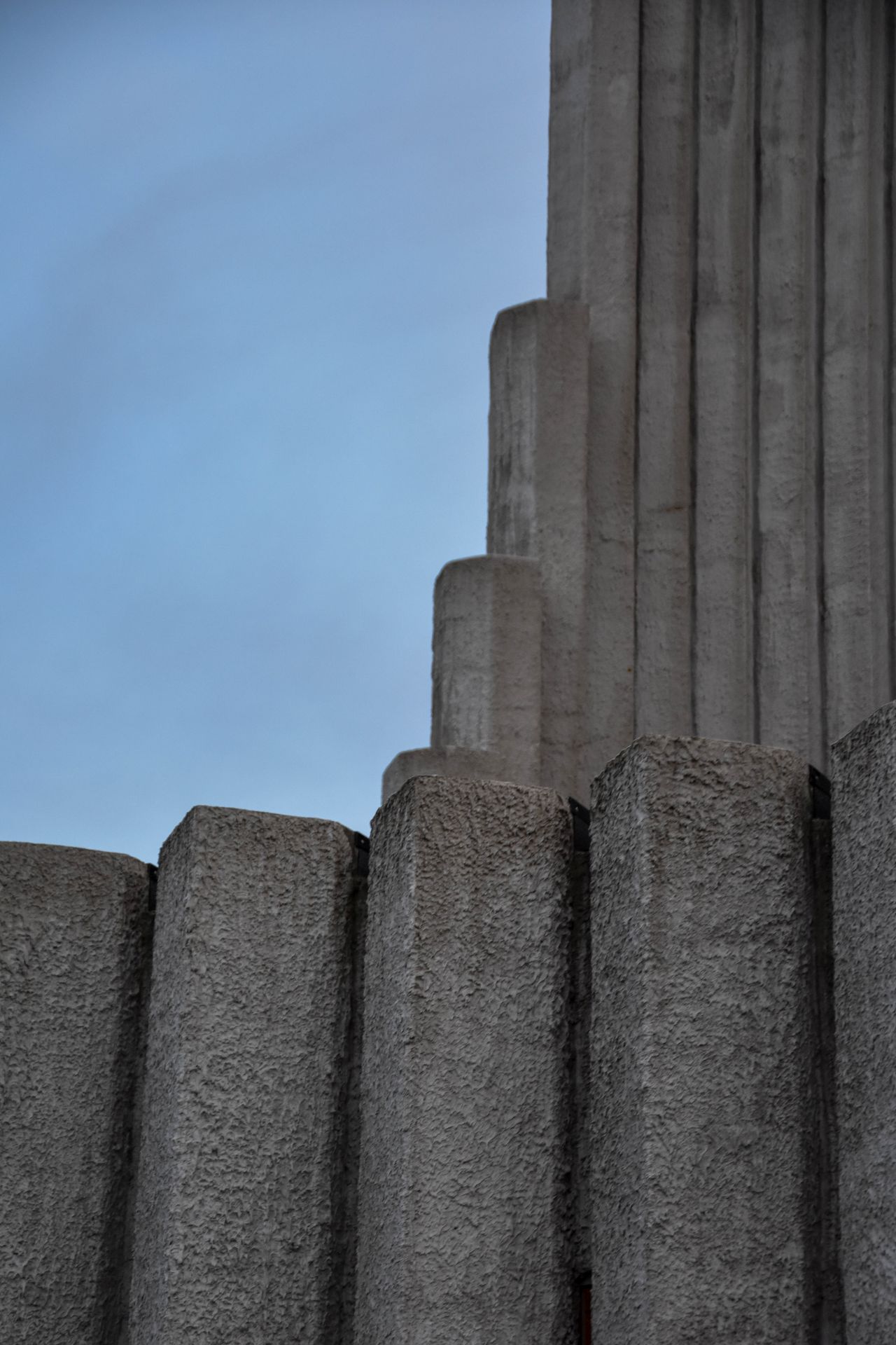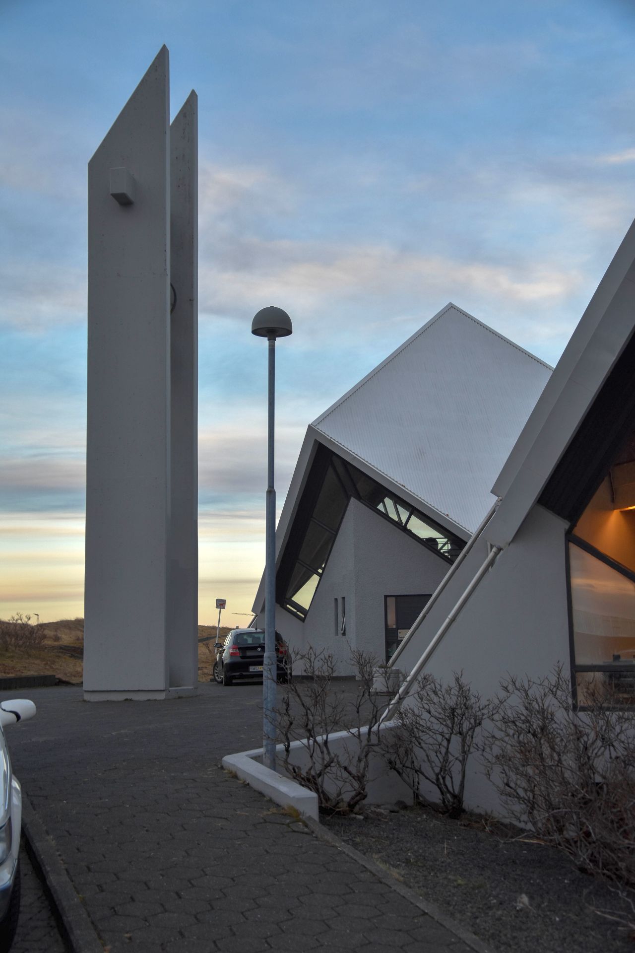 Da se primetiti da sivo betonsko jezgro sa zidovima i beli limeni krovovi odigravaju dijalog prirode i čoveka sa obližnjim snežnim vrhovima Rejkjavika.