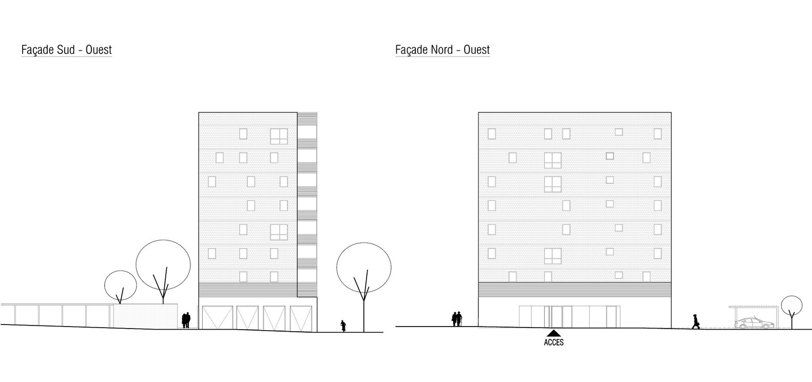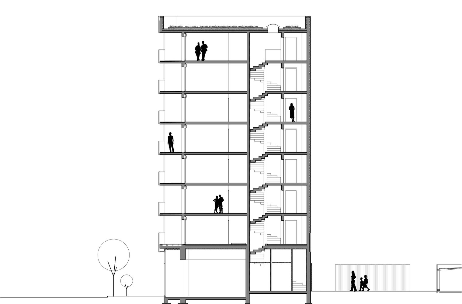 Takođe, i druge fasade su dobile tretman koji podržava pročelje na bulevaru. One su urađene od ploča u sivoj boji tako da se pravi jak konrtast u odnosu na drvene trake što pojačava njihovu prirodnu teksturu. Spoj ove dve fasade urađen je kroz fin detalj, odnosno tako da je jedna drvena traka provučena kroz celu širinu fasade čime je ne samo naglašena spratnost već je prevelika siva površina vizuelno presečena, piše ArchDaily.