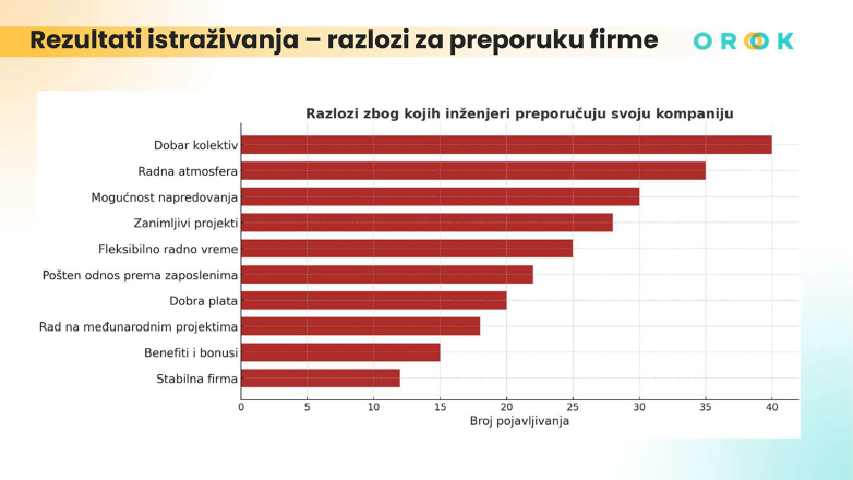 Naime, u prvih pet razloga za preporuku poželjnog poslodavca našli su se (1) dobar kolektiv, (2) radna atmosfera, (3) mogućnost napredovanja, (4) zanimljivi projekti i (5) fleksibilno radno vreme. Dobra plata našla se tek na sedmom mestu na listi ključnih kriterijuma za preporuku poslodavca, a slede je učešće na međunarodnim projektima, benefiti i bonusi.