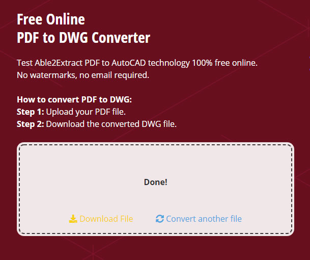 Ova pogodnost, koju besplatno nudi sajt za manipulisanje PDF fajlovima Investintech, obradovaće mnoge. Što je najbolje od svega, postupak je veoma jednostavan. Kako biste konvertovali PDF u DWG potrebno je samo da okačite dokument u PDF formatu, sačekate nekoliko trenutaka i preuzmete njegovu DWG verziju. Ipak, za nešto složenije crteže moraćete da budete malo strpljiviji i sačekate malo više vremena, što je i dalje daleko brži postupak nego da ga sami precrtavate.