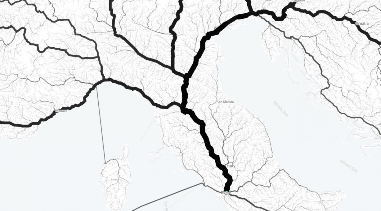 Dobijena kartografija otkriva rutu puteva gde se vidi da svi putevi, a kako drugo, bez prepreka i velikih obilaznica vode u Rim.