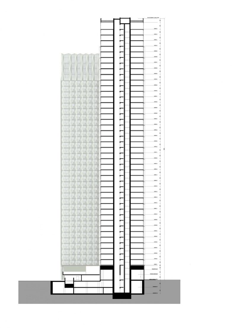 Eksterijer objekta, koji čine dve povezane kule, karakteriše geometrijski dizajn, što je zapravo inspirisano arhitekturom bloka izgrađenog sredinom prošlog veka. Dok je na nižoj kuli od 38 spratova dominantan nešto razigraniji raspored sjajnih zelenih ploča od terakote, viša kula od 44 sprata ima smireniji izgled.