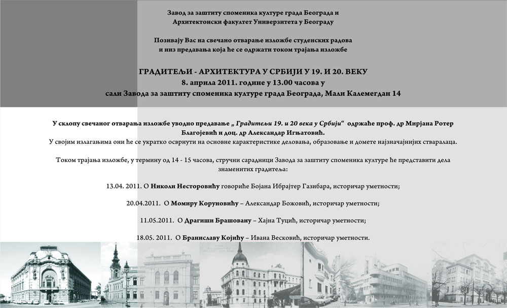 Zavod za zaštitu spomenika kulture grada Beograda i Arhitektonski fakultet Univerziteta u Beogradu organizovaće, od 8. aprila do 18. maja, izložbu radova studenata tog fakulteta „Graditelji – arhitektura u Srbiji u 19. i 20. veku”.