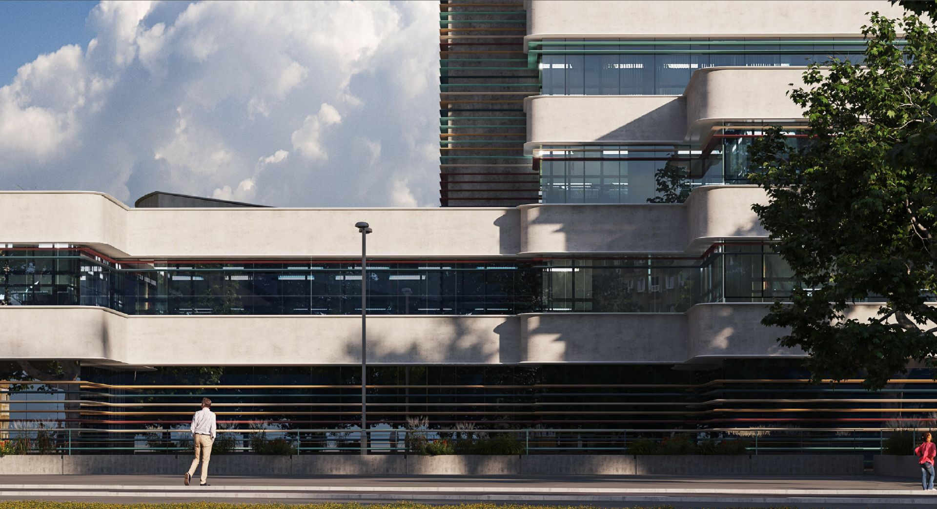Ograda na terasama je od providnog stakla, a da bi se sprečio prodor sunčevih zraka u unutrašnje prostorije predviđeni su horizontalni brisoleji u nasumičnom ritmu pet različitih boja.