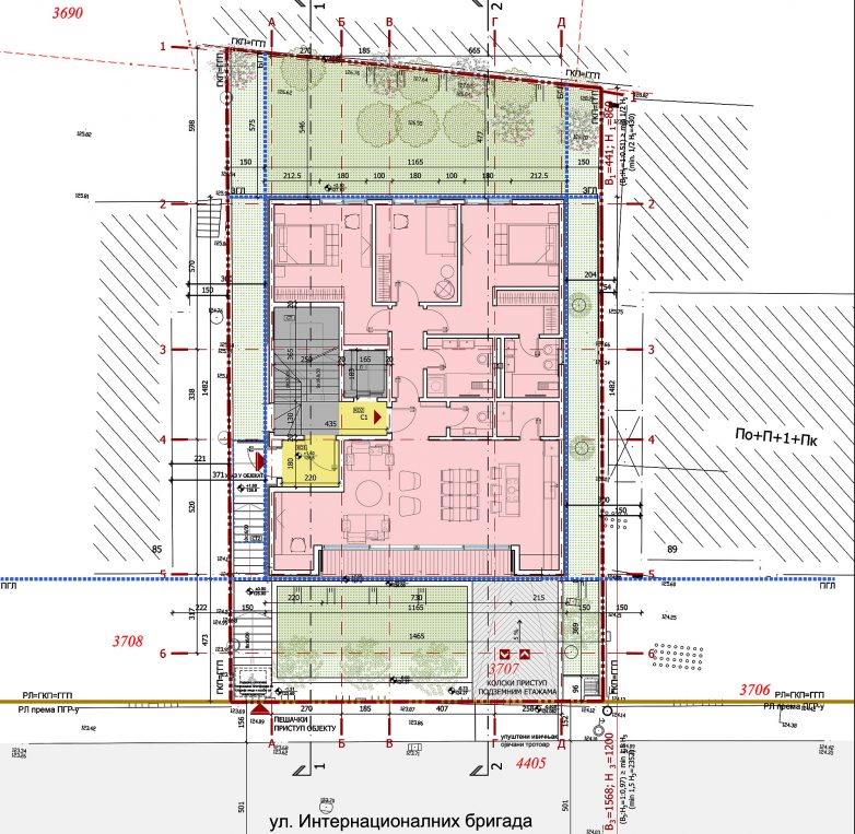 Apsolutna visinska kota pristupne saobraćajnice planiranom stambenom objektu, iz pravca Ulice Internacionalnih brigada, kao pešačkog pristupa, iznosi 123,69 mnv.