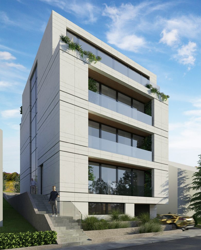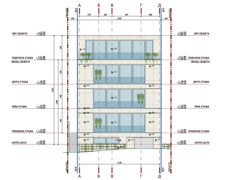 Tako formiran položaj korpusa nove fizičke strukture, kreiran slojevito i kroz više nivoa, primenjenim povlačenjima ka unutrašnjosti parcele sa regulacionih ravni, nedvosmisleno naglašava fasadna platna i oblikovni karakter novoprojektovanog stambenog objekta.