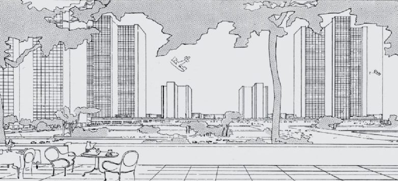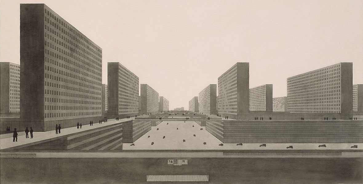 Jedna ilustracija, gde mračne korpuse zgrada opasuju lebdeći trotoari, pripisana Le Korbizjeu je zapravo iz opusa Ludviga Hilbeshajmera.