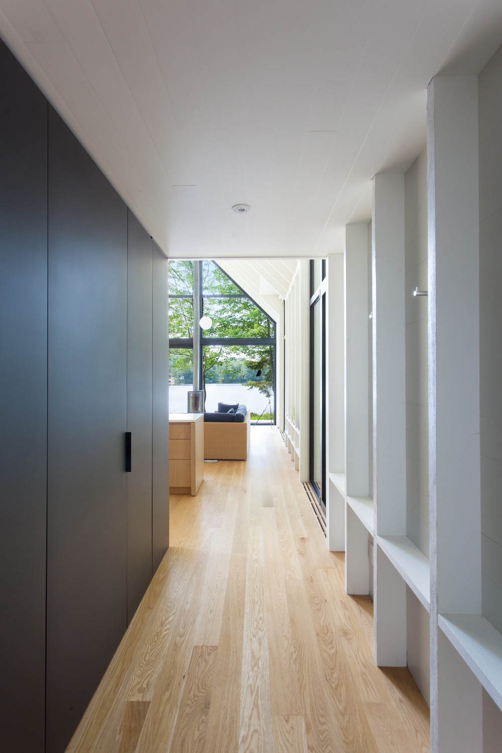 Potpuna transparentnost južne fasade tokom jeseni i zime omogućava dovoljan prodor sunčeve svetlosti u unutrašnjost, dok gusta okolna stabla drveća štite kuću od jakog letnjeg sunca i pružaju privatnost kada je količina čamaca na jezeru znatno povećana.