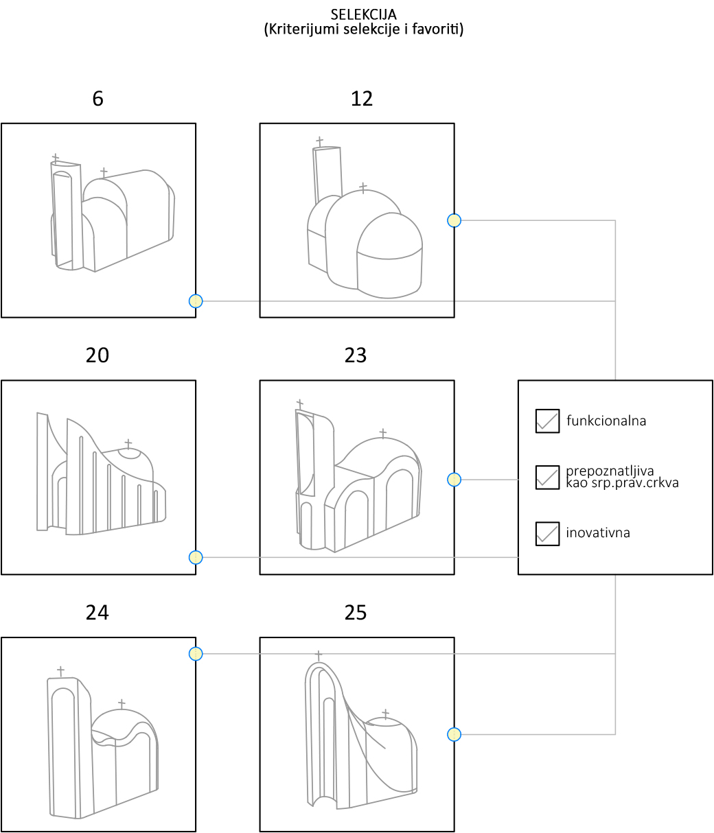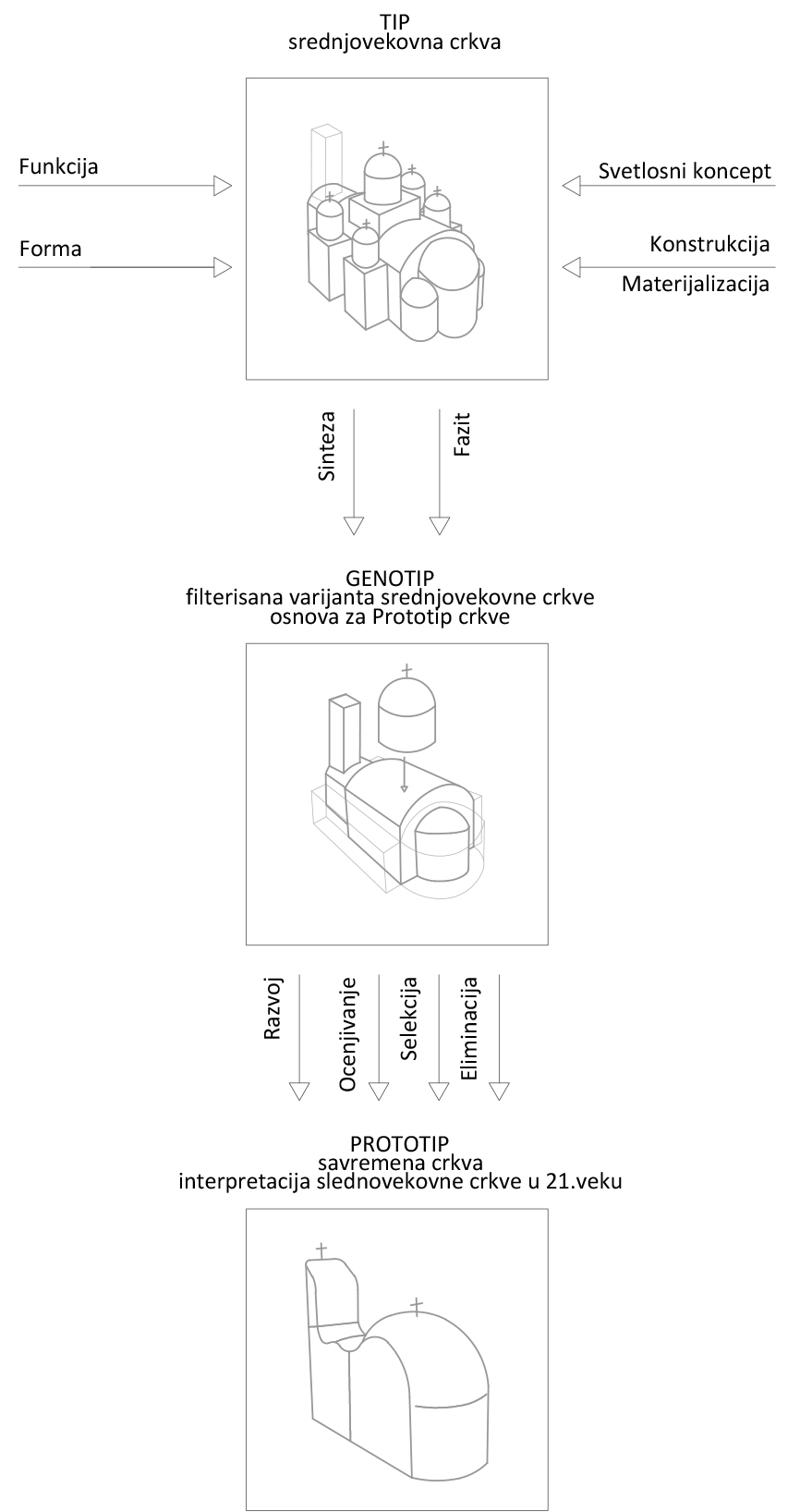 Kroz tu analizu formirala je Tip crkvu tj. tipičnu srednjovekovnu crkvu. Zatim je tu Tip crkvu provukla kroz jedan filter koji predstavlja vreme u kojem se nalazimo i dobila pročišćenu Tip crkvu – Genotip crkvu.