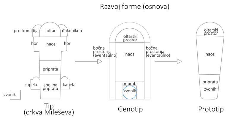 Dakle, njen put modernizacije tradicionalog stila je imao tri koraka: Tip (srednjovekovna crkva) – Genotip (pročiščena srednjovekovna crkva) – Prototip (razvijena srednjovekovna crkva).