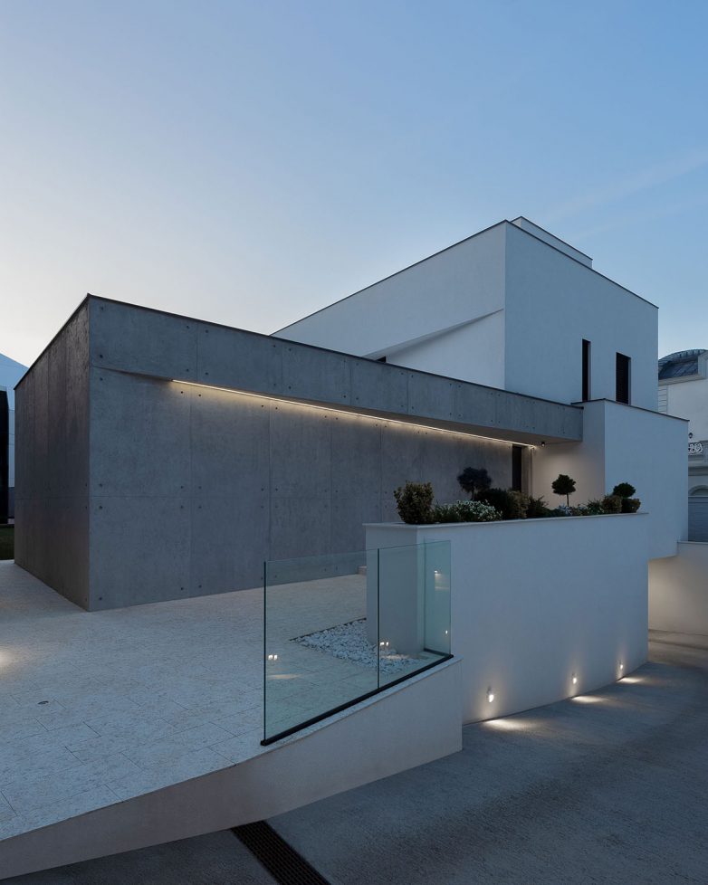 Tretman fasade podeljen je u dve jasno razdvojene celine. Postament objekta čini prizemlje obrađeno u natur betonu, dok su volumeni na spratu snežno bele boje. Drugi sprat je povučen, a njegovo prisustvo se tek nazire. Ograda je staklena i gotovo neprimetna.