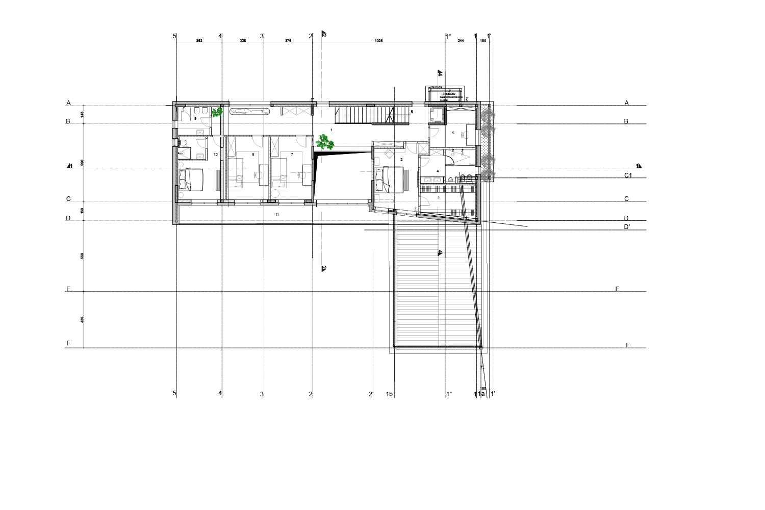 Na spratu su odvojene spavaće sobe za decu i roditelje, a tu se nalazi i odvojeni radni kutak. Povučeni sprat (drugi nivo) namenjen je za teretanu i preko njega se izlazi na krovnu terasu, na kojoj su smešteni solarni paneli. U podzemnoj etaži nalazi se garaža, kao i prateće prostorije – vešeraj i mašinska soba.
