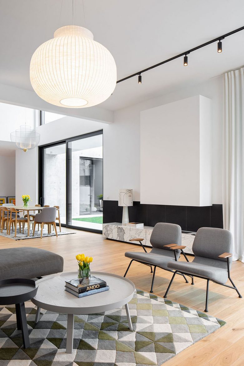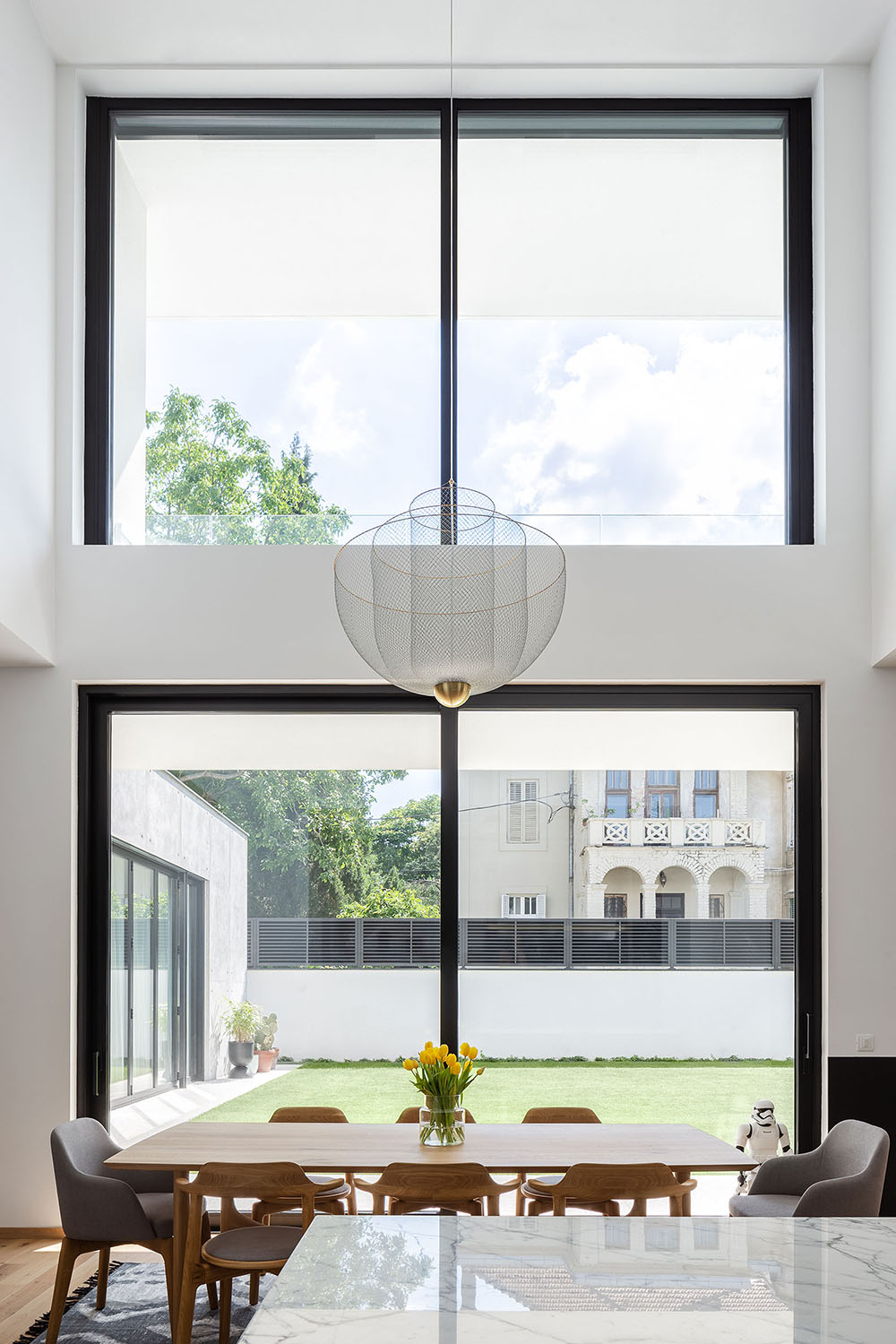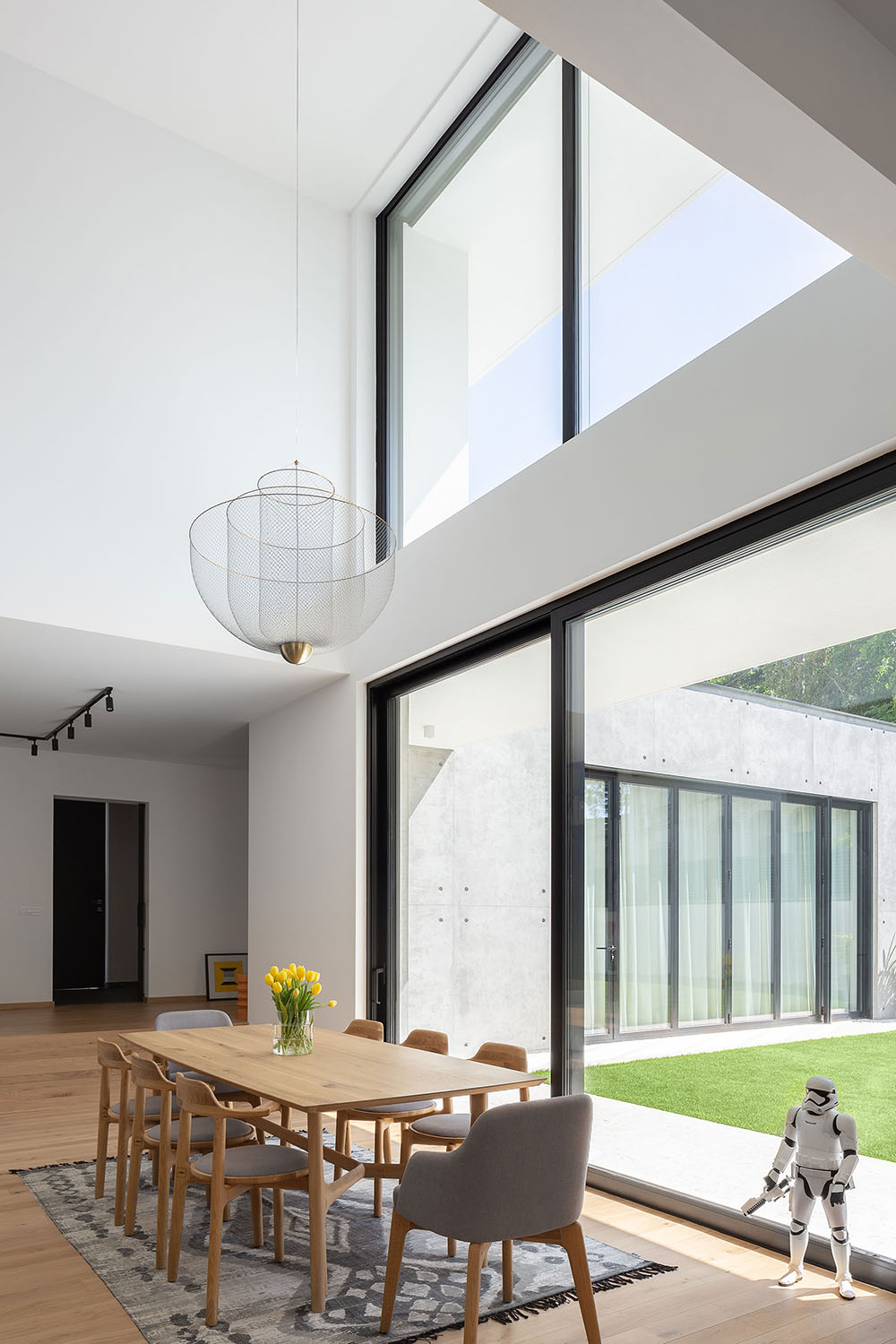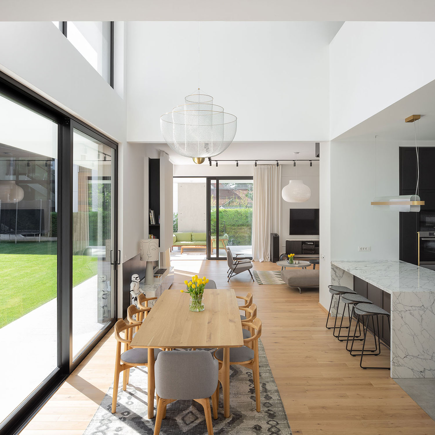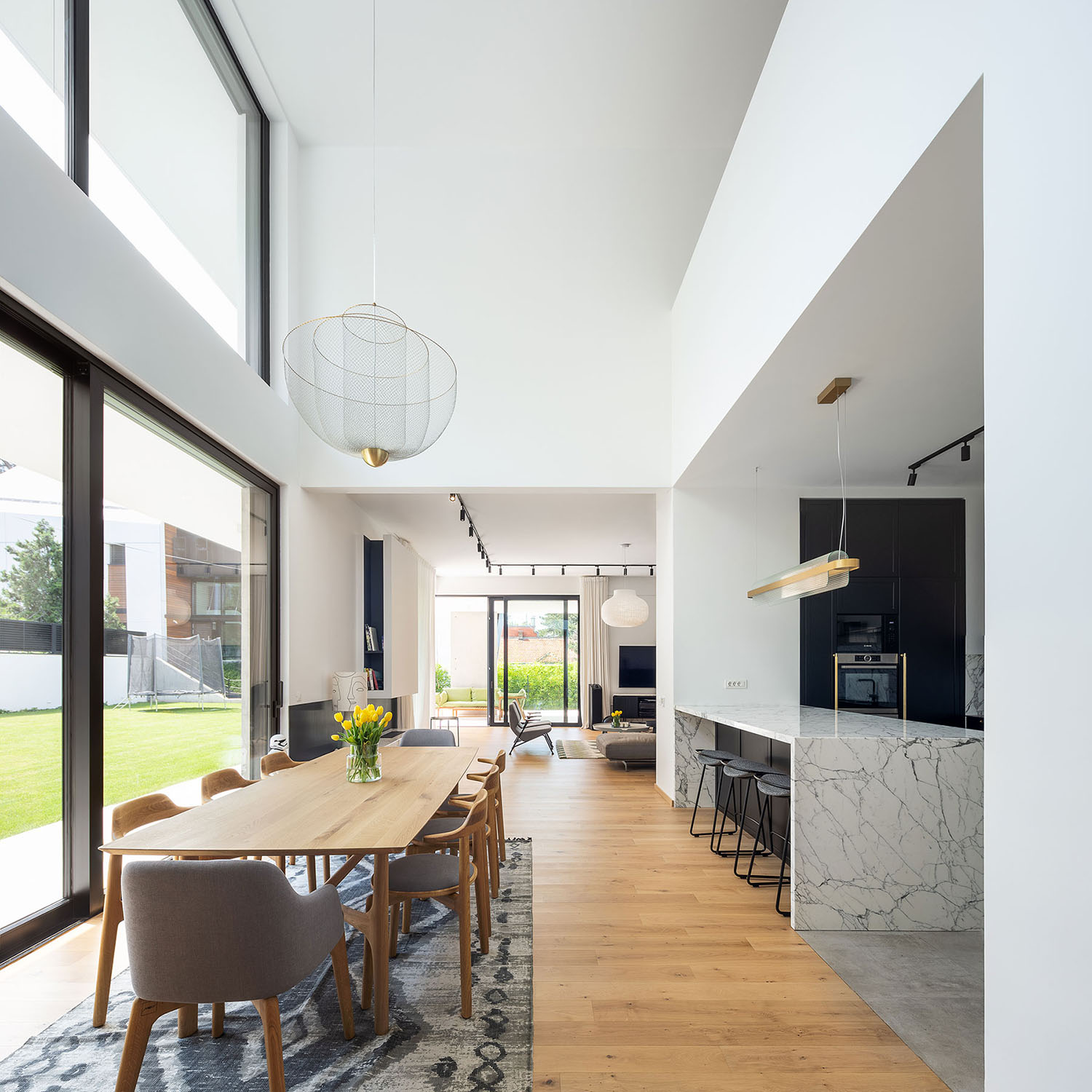 Želja klijenta bila je maksimalni dimenzioni komfor svih zona, dobra prirodna provetrenost i njihova orijentacija i otvorenost prema dvorištu. „Formiranjem zona koje se nadovezuju jedna na drugu, došlo se na ideju o formiranju duple visine iznad prostora trpezarije i puštanju osvetljenja u centralni deo objekta“ – navode projektanti. Ne samo da dominira svojim volumenom, već je atrijum i orijentacioni centar kuće, dok prostoru trpezarije daje svečan i reprezentativni karakter.
