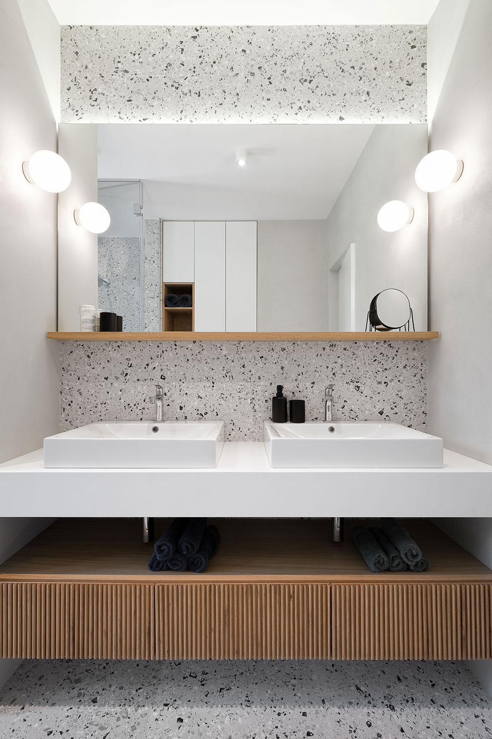 Od materijali u enterijeru zastupljeni su prirodno i bojeno drvo, prirodni mermer, keramika, teraco, te velike bele površine. Najveći broj komada nameštaja dizajniran je po meri od strane arhitekata, dok je korišćeno i nekoliko dizajnerskih brendova.