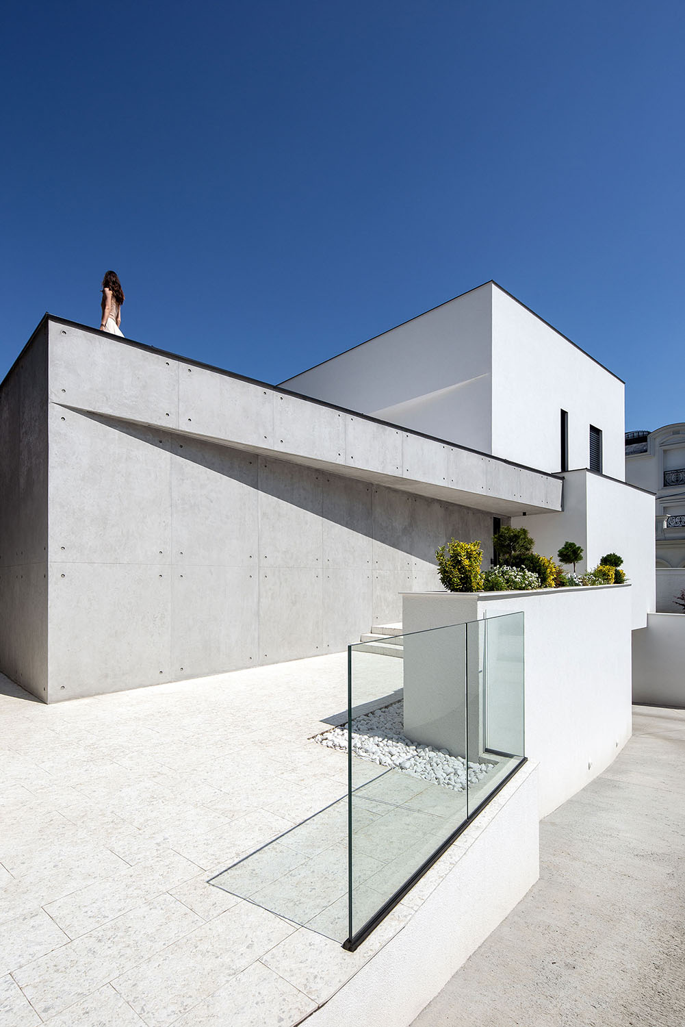 Tretman fasade podeljen je u dve jasno razdvojene celine. Postament objekta čini prizemlje obrađeno u natur betonu, dok su volumeni na spratu snežno bele boje. Drugi sprat je povučen, a njegovo prisustvo se tek nazire. Ograda je staklena i gotovo neprimetna.