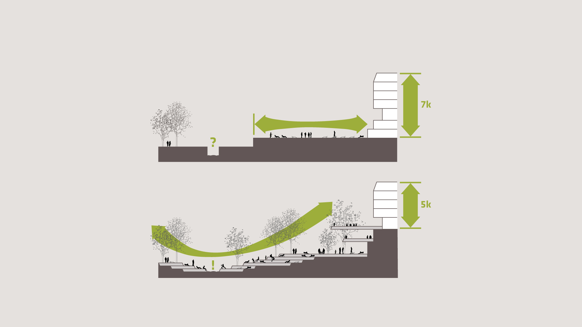 Ravnomernom obradom prostora od potoka do nivoa hotela, vizuelno se umanjuje zgrada hotela sa sedam na pet spratova. Nova terasasta konstrukcija dodatno smanjuje izgled postojeće zgrade i približava celokupni raspored ljudskim proporcijama.