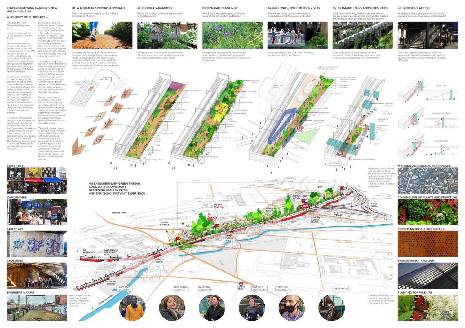 James Corner iz James Corner Field Operations je sa druge strane dodao da je Camden jedno izvanredno mesto, sa živahnom, modernom i raznolikom zajednicom, koja će uskoro uživati u neverovatno jedinstvenoj i javnoj zelenoj niti koja povezuje različite zone.