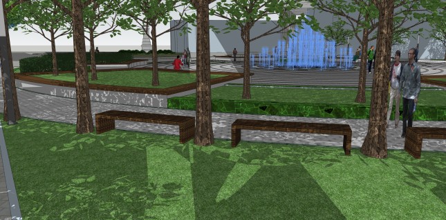 Trg će biti podeljen u parternu fontanu, tri bazena s mirnom vodom i zeleni deo s žardinjerama, klupama, travom i cvećem.