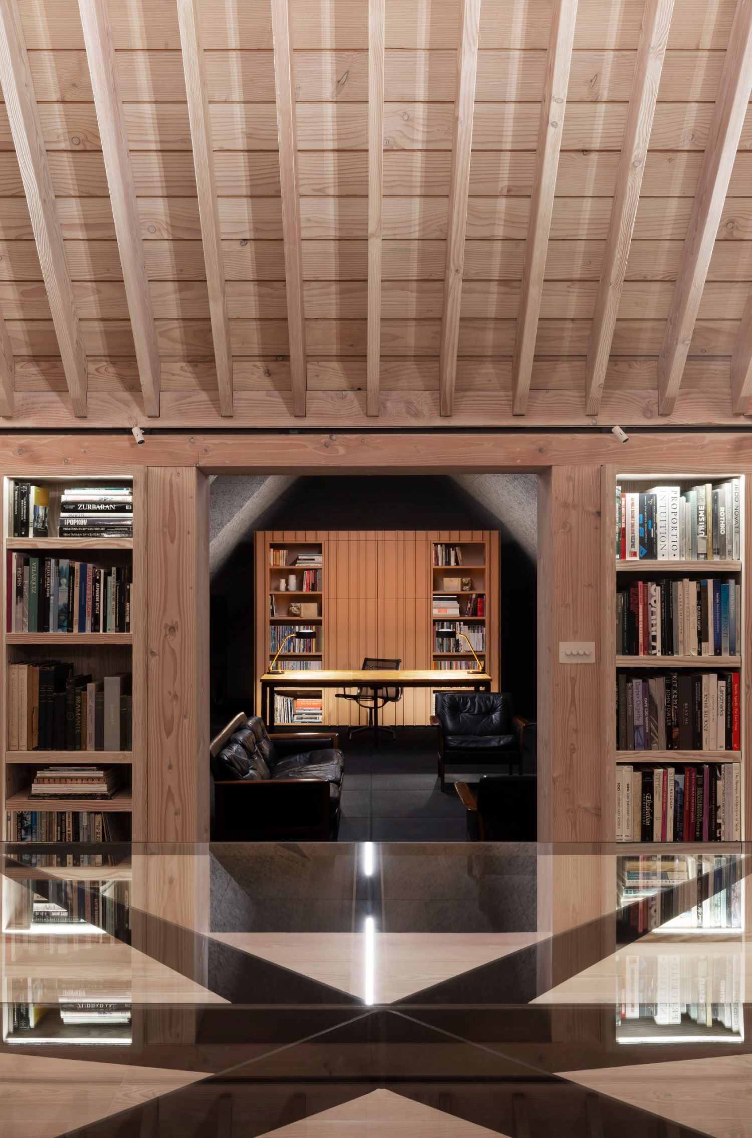 Drvena krovna tavanica i stakleni sto čine centralni momenat obnovljenog amara u kojem je sada studio.