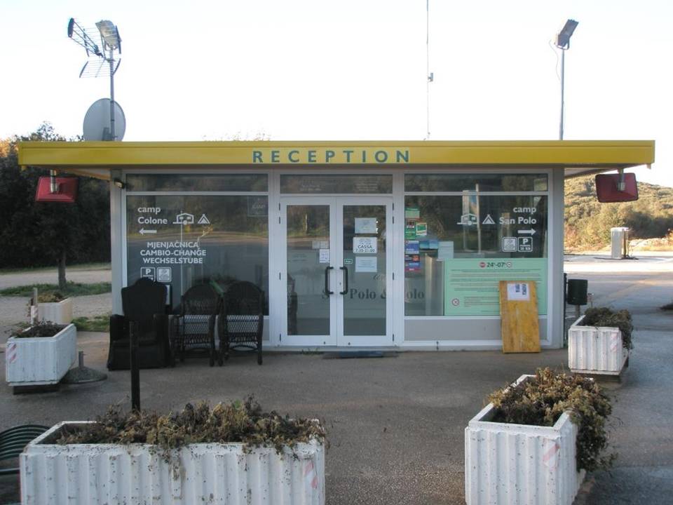 Recepcija se nalazi na ulazu, to jest, na dodirnoj tački između dva kampa Mon Perina (San Polo i Colone). Osim same rekonstrukcije postojećeg gabarita recepcije, dodata je spoljašnja pergola kao svojevrsni pretprostor za okupljanje gostiju koja uz samu zgradu recepcije obuhvata i tri obnovljena kontejnera za potrebe uprave kampa tokom sezone. Trokutasti oblik osnove proizašao je iz oblika sugerisanog postojećim saobraćajnicama koji usmeravaju posetioce u jedan ili drugi kamp.