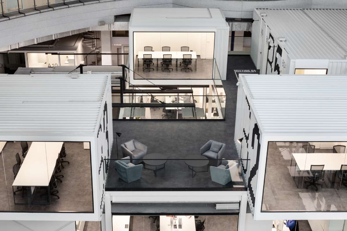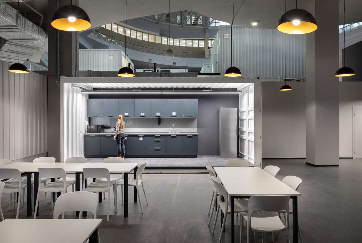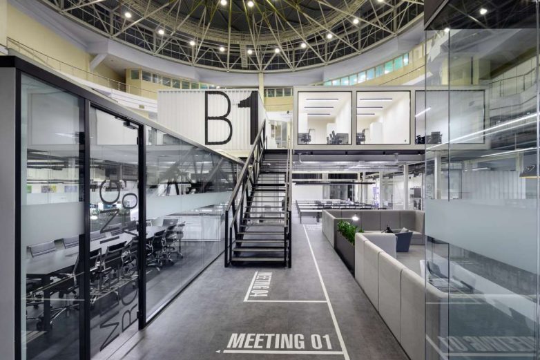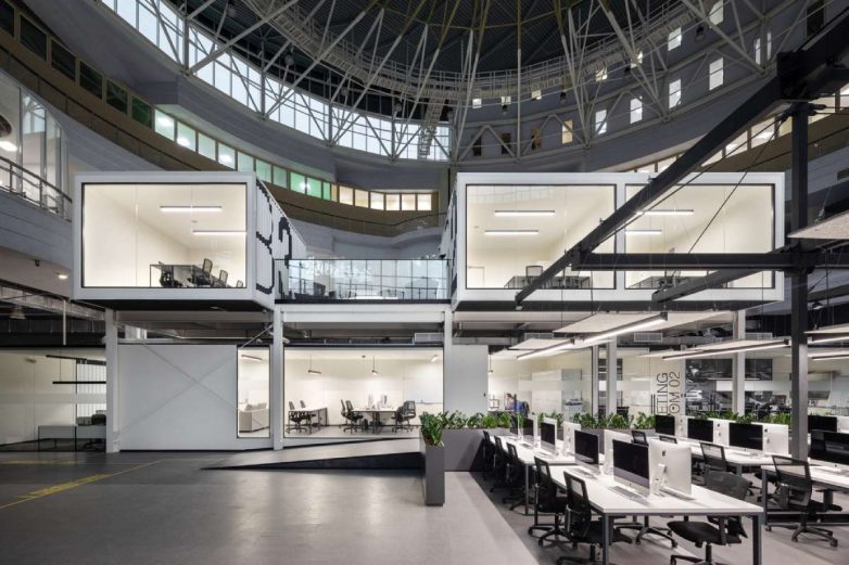Naime, zbog velike visine prostora, arhitekte su iskoristile kontejnere kako bi što efikasnije i jeftinije dobile korisne kvadrate. Tako su pod sajamskim kupolama nastale vertikalne strukture poduprte čeličnom konstrukcijom čime je prostor maksimalno iskorišćen.