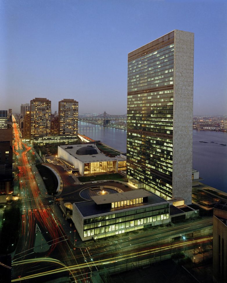 U jednom od prethodnih tekstova na temu moderne arhitekture, govorili smo o njenoj ulozi u širenju revolucionarnih ideja (političkih, naučnih itd.), ali i kao faktoru pomirenja među narodima. Ova poslednja uloga svoju kulminaciju doživljava nakon Drugog svetskog rata, kada se centar svetskog uticaja iz Evrope preseljava u Sjedinjene Američke Države. Preuzimanje ove političke štafete možda najbolje može da se sagleda kroz arhitekturu jedne svetske organizacije – Lige Naroda, kasnije preoblikovane u Ujedinjene Nacije.