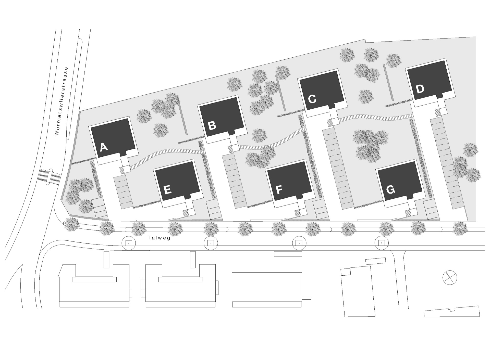 Pojedinačne zgrade tako su orijentisane da svaka fasada u toku dana bude direktno osunčana, a tako da terase budu jugu. Na parceli, zgrade se nižu naizmenično (u pravcu istok-zapad), a prostor između njih ispunjen je zelenilom – travom i drvećem. Svaki objekat, takođe, ima i zelenu krovnu terasu, a svaki stanar na terasi ispred stana ima i svoju malu, privatnu baštu.