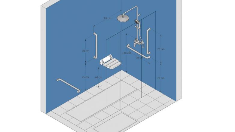 Preporučljivo je da se izbegavaju kade zbog poteškoća ulaza i izlaza, a tuš kabine bi trebalo da imaju što manju visinu kadice. Tuš kabina bi trebalo da bude minimum 80 centimetara široka i preporučeno je da se obezbedi prostor za još jednu osobu, ukoliko korisnik kupatila dođe u situaciju da mu je potreban negovatelj.