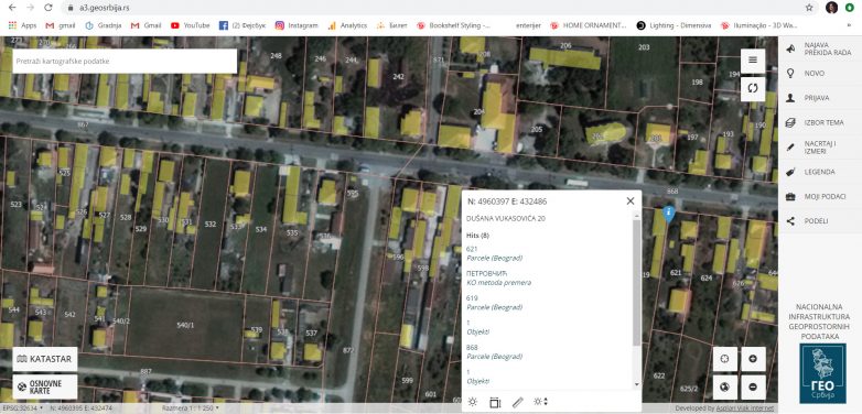 Ako znate gde se zemljište nalazi, zumirajte taj deo na karti GeoSrbija i pritisnite dugme „Katastar„. Tada će vam se ocrtati sve linije parcela kao i ubeleženi objekti na njemu (ako ih ima). Ovde ćete lako pronaći broj parcele, adresu i broj objekata na parceli kao i podatak kojoj katastarskoj opštini plac pripada.