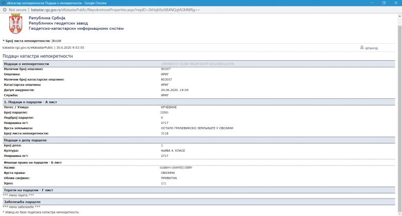 Zbog provere, morate upisati sigurnosni kod sa slike iznad. Nakon toga će dobićete sve podatke o traženoj parceli koji izgledaju ovako: