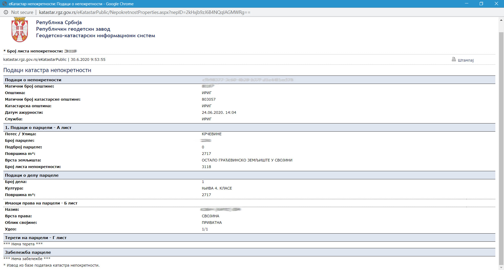 Zbog provere, morate upisati sigurnosni kod sa slike iznad. Nakon toga će dobićete sve podatke o traženoj parceli koji izgledaju ovako: